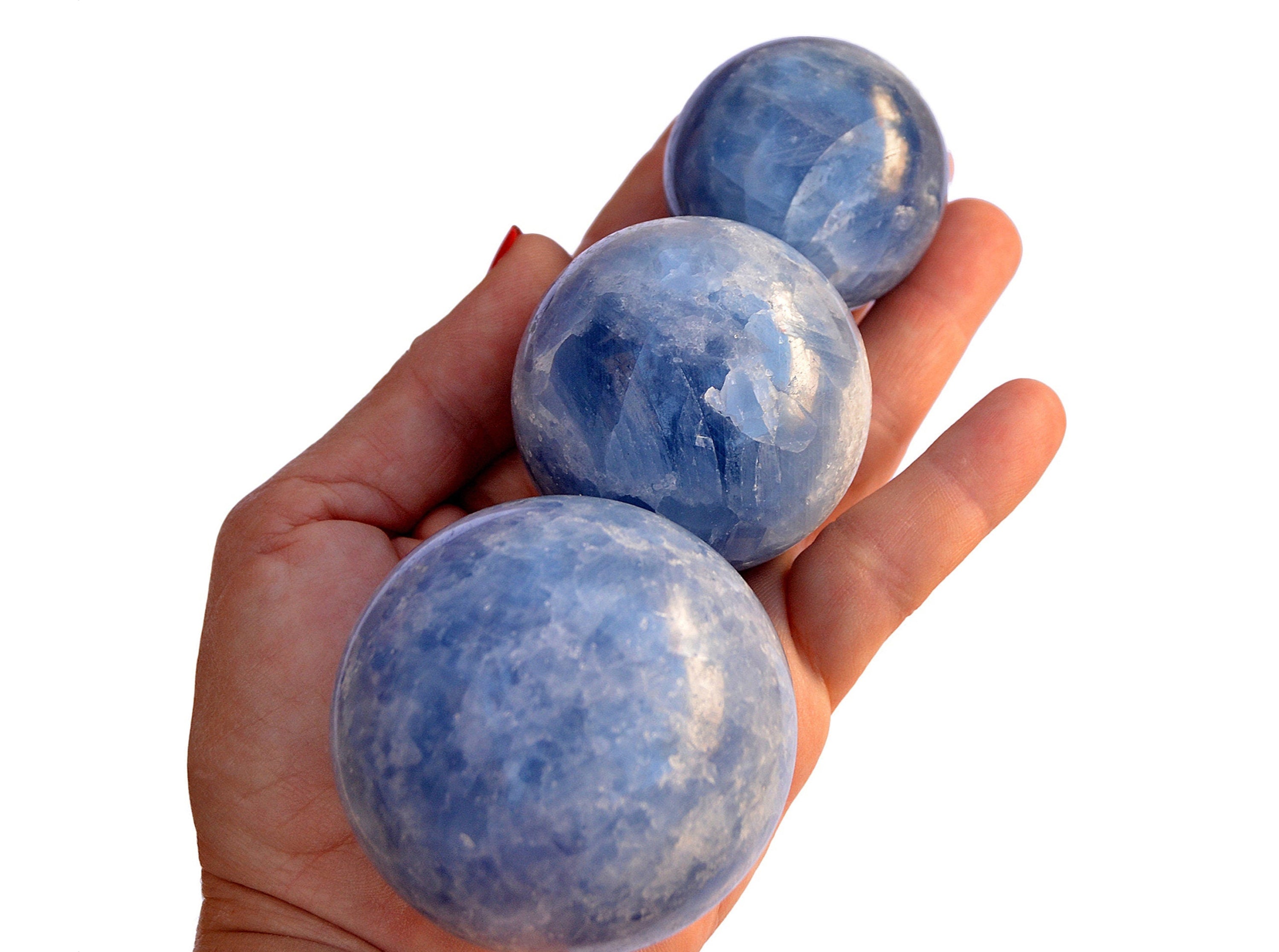 Blue calcite crystal sphere stone. You get one blue calcite ball very similar to appear in image above, picked at random. Please expect some slight variation in terms of color, transparency, size and shape, as there are some variations unique for each stone. Note that all crystals are natural, so sometimes little imperfections can appear.
