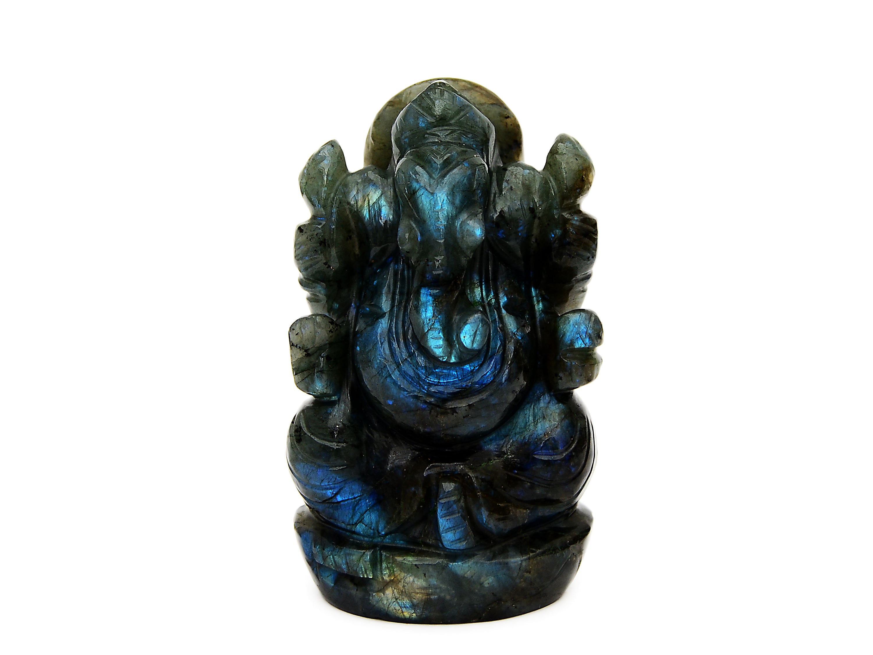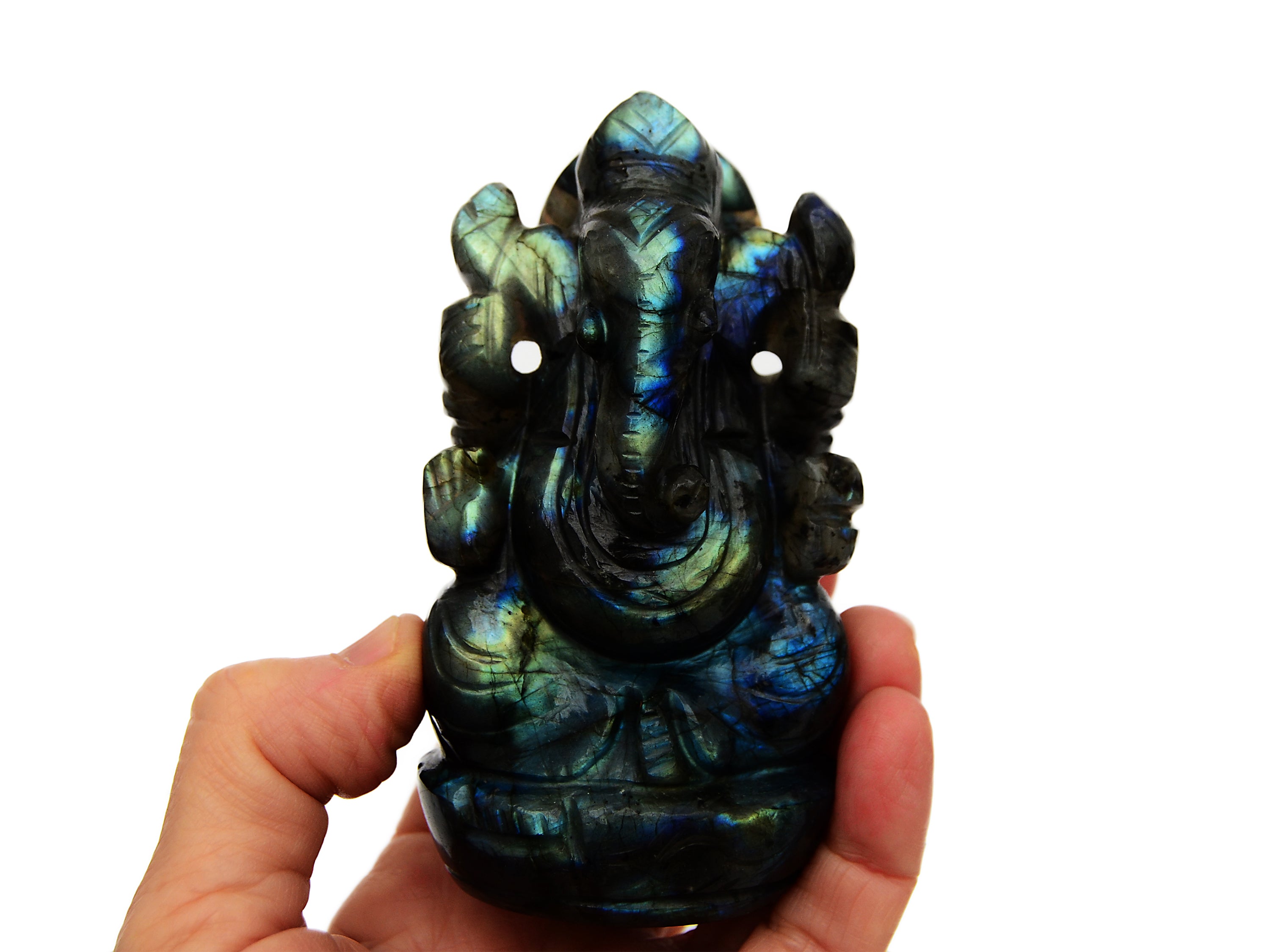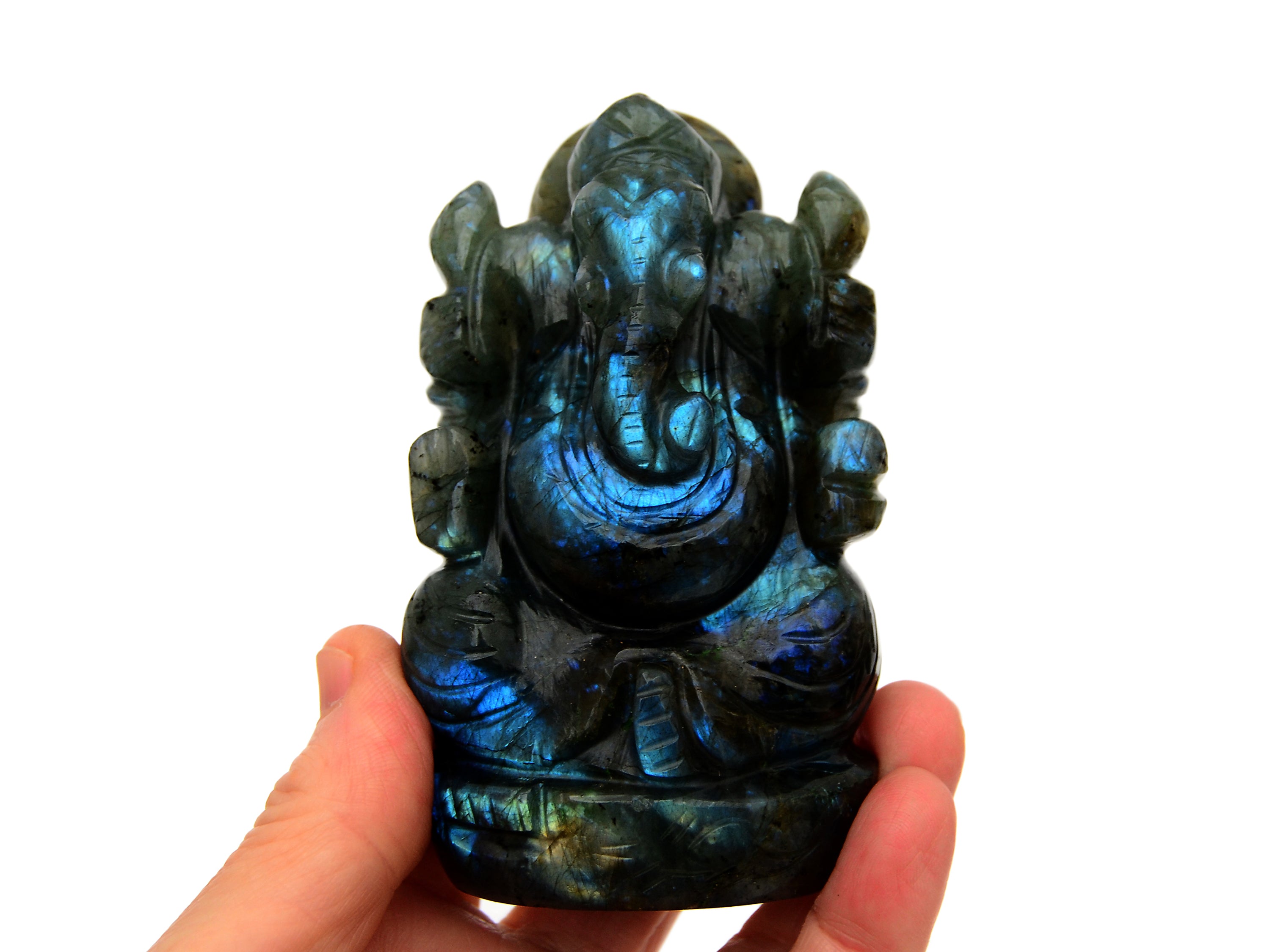 Labradorite Ganesha deity figure. You choose one hand-carved crystal sculpture that appear in image above. Note that all crystals are natural, so sometimes little imperfections can appear.