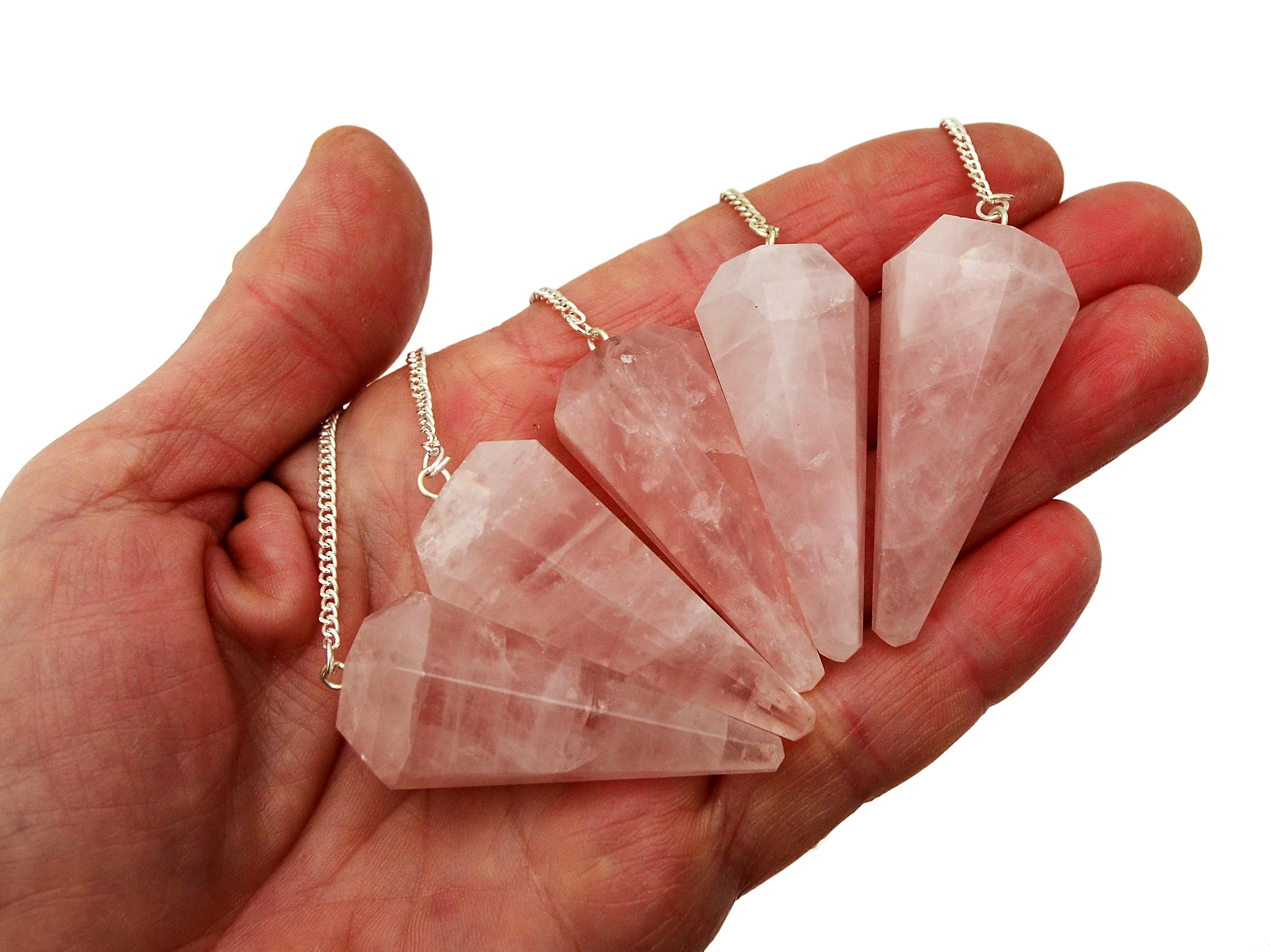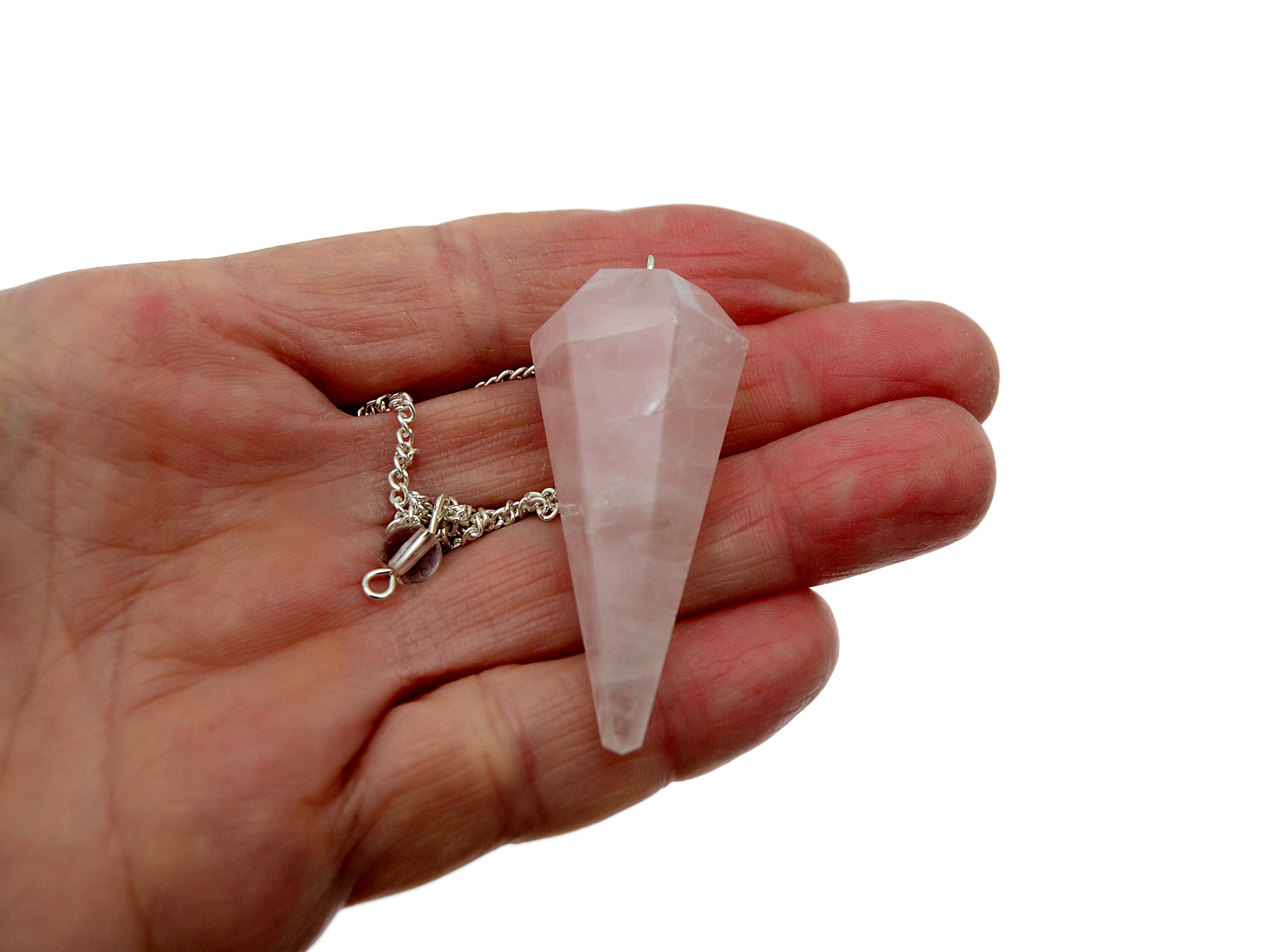 Rose quartz faceted point pendulum. You will receive a crystal pendulum featuring a small clear quartz bead at the end of the chain, very similar to the image above, picked at random. Please expect some slight variation in terms of color, size and shape, as there are some variations unique for each stone. Note that all crystals are natural, so sometimes little imperfections can appear.