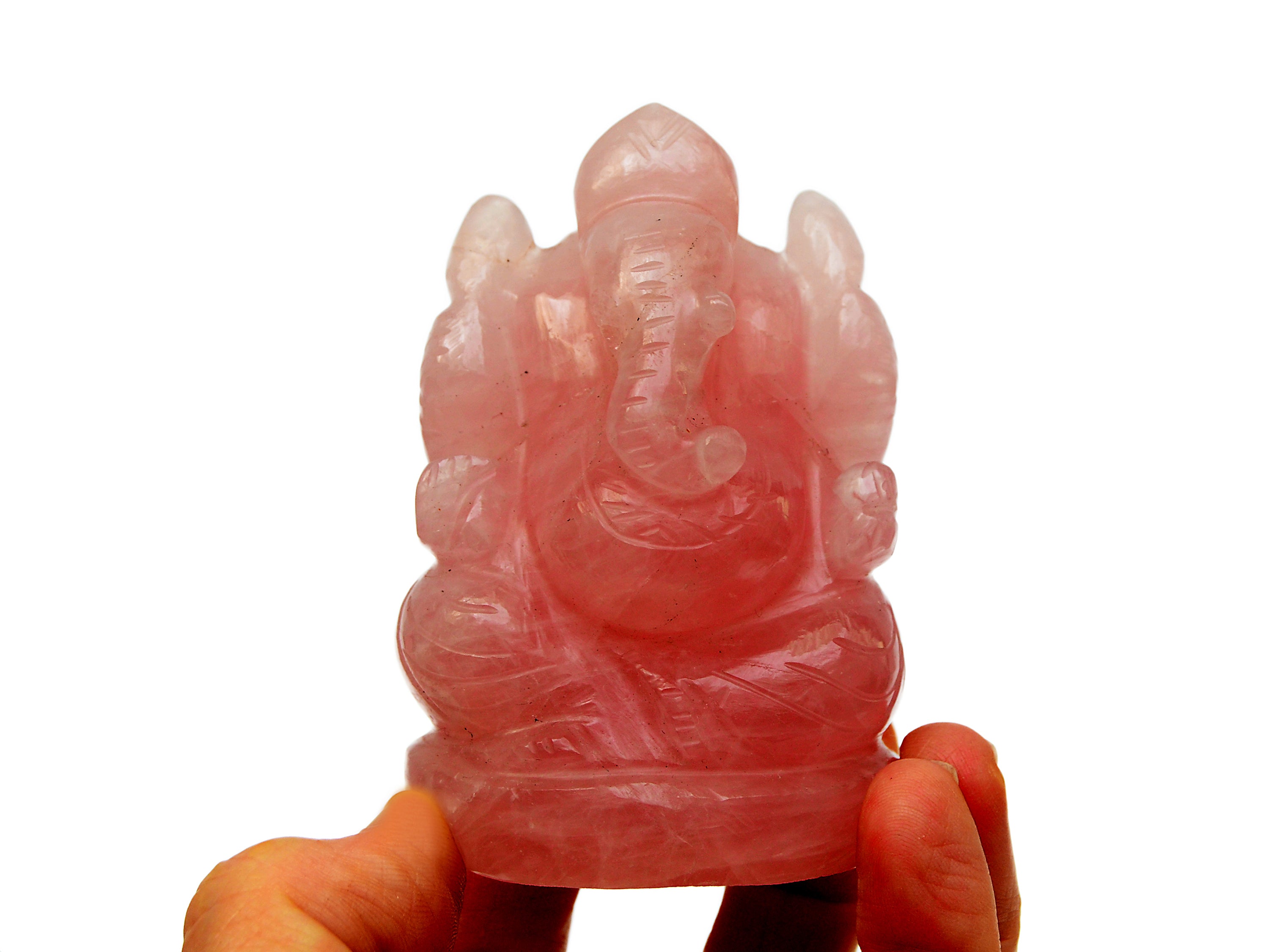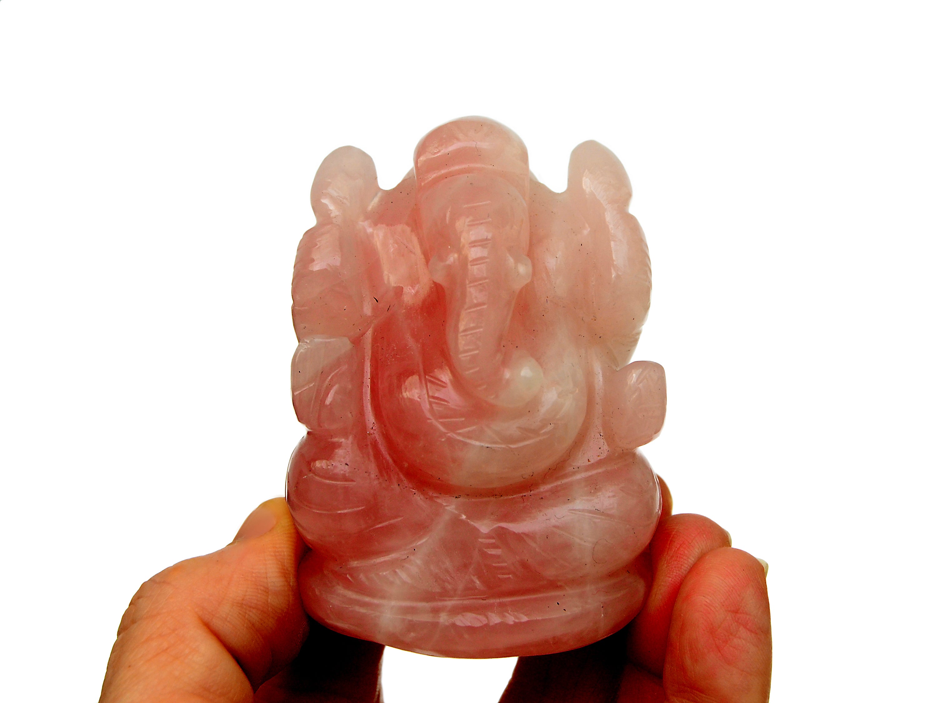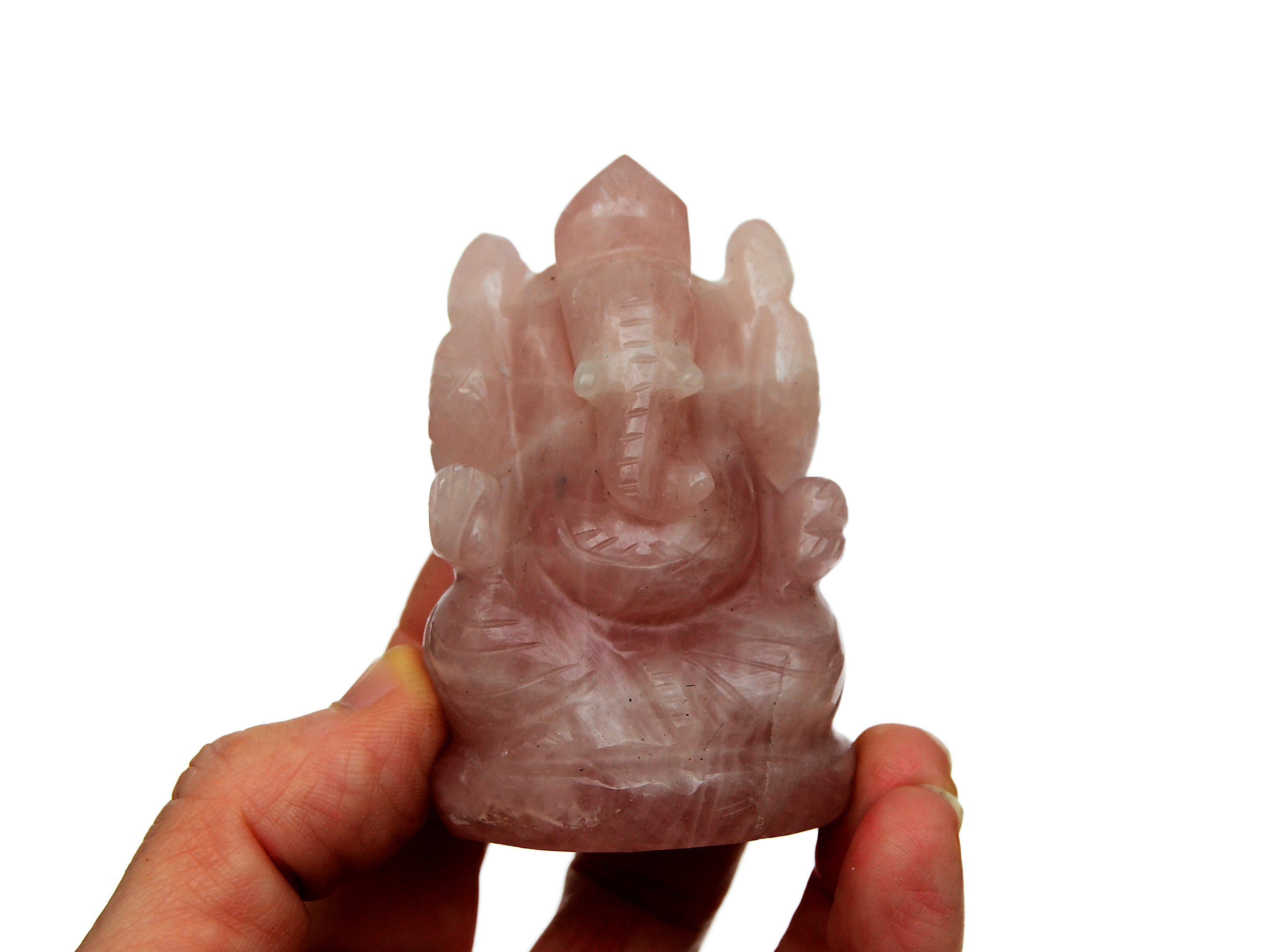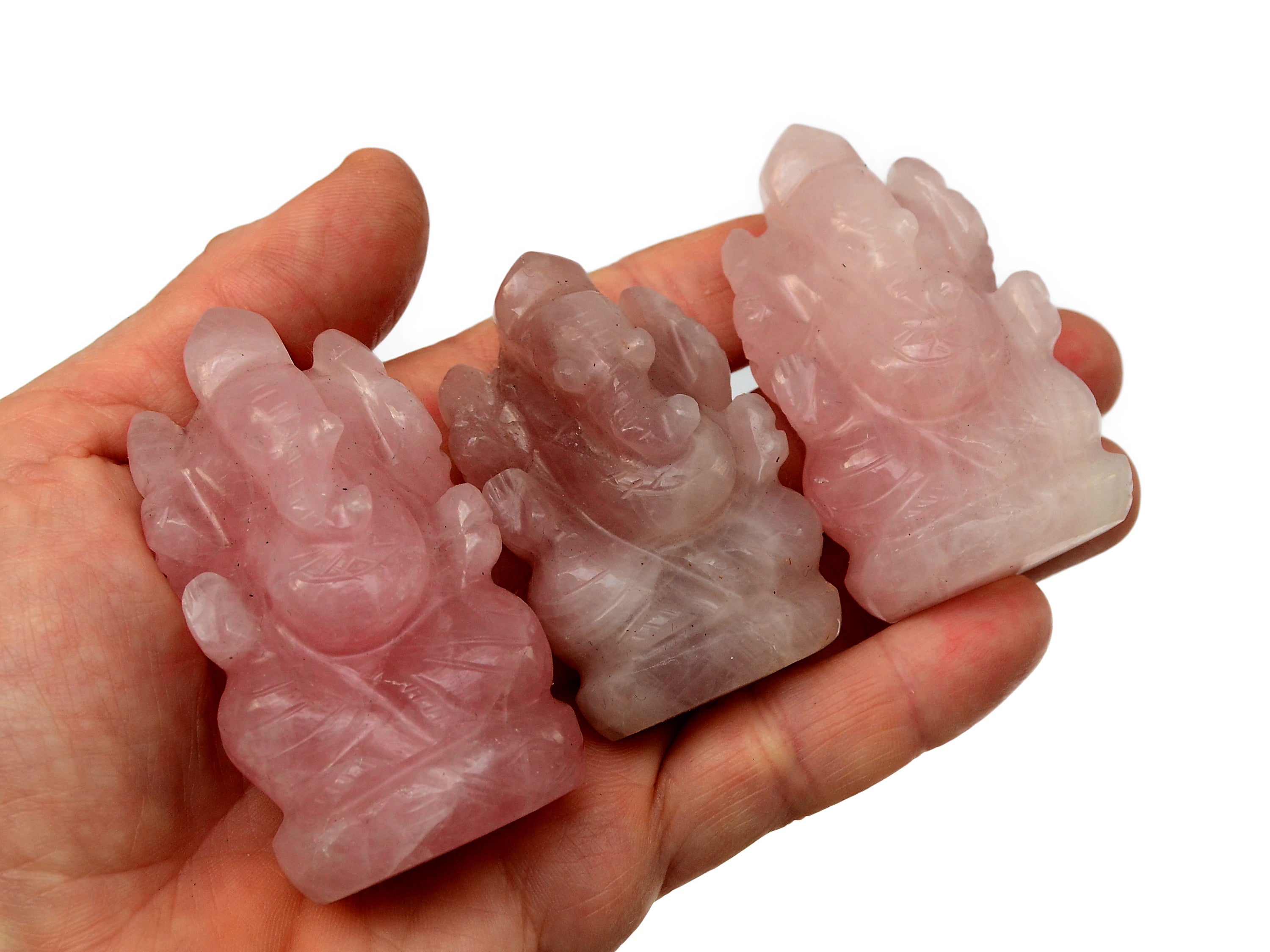 Rose quartz Ganesha sculpture. You get one hand-carved pink quartz crystal figure very similar to appear in image above, picked at random. Please expect some slight variation in terms of color and transparency, as there are some variations unique for each stone. Note that all crystals are natural, so sometimes little imperfections can appear.