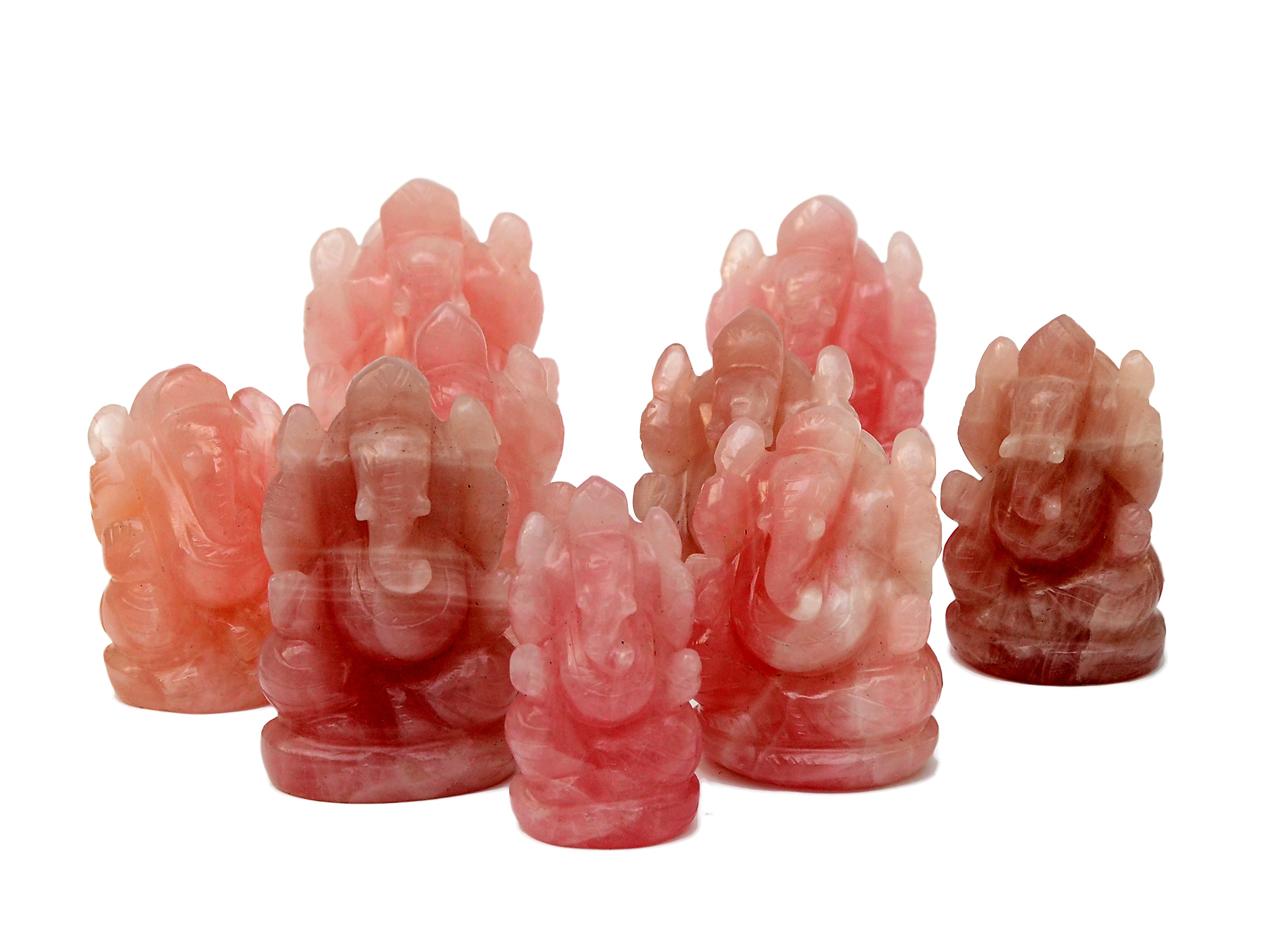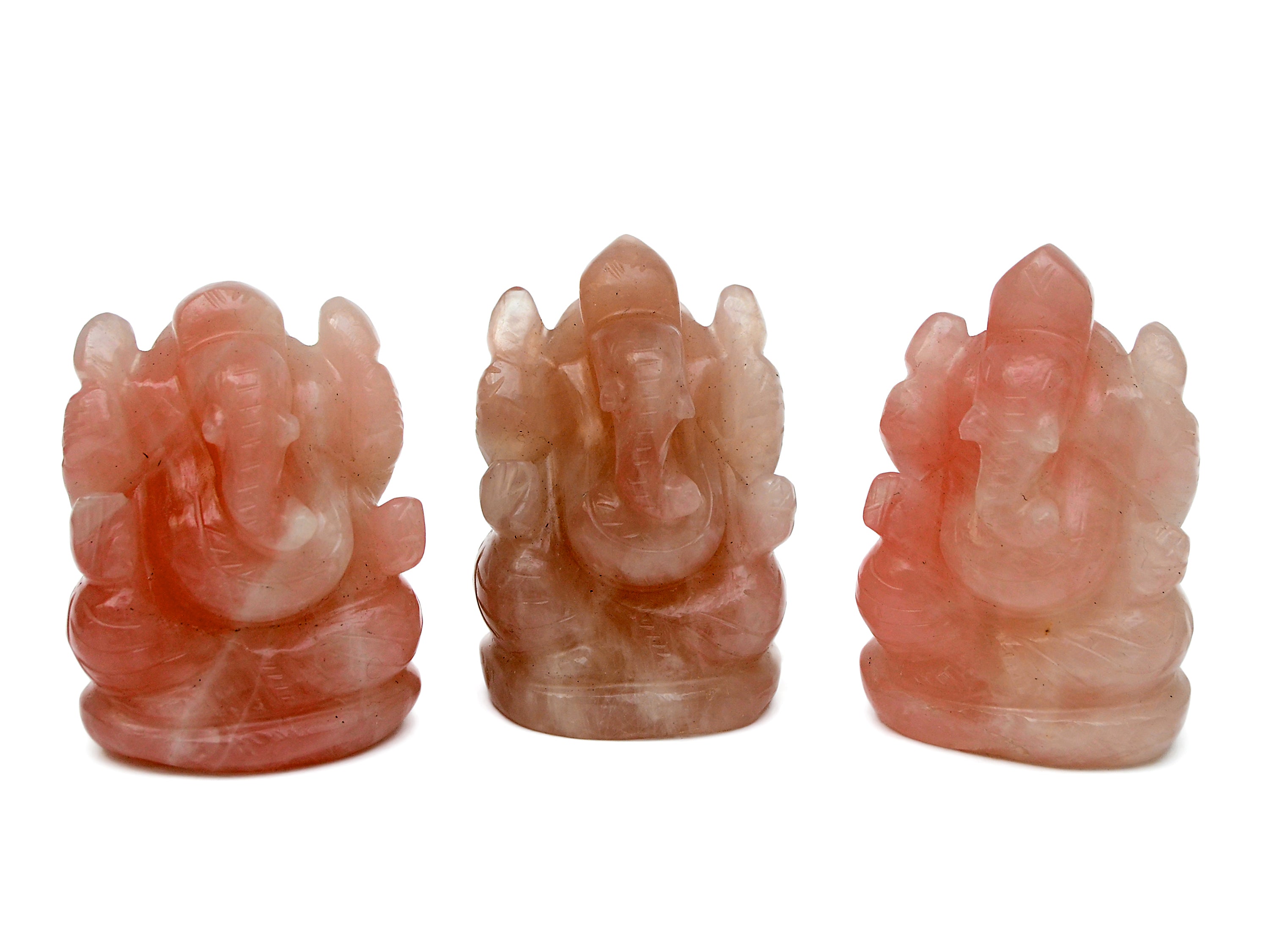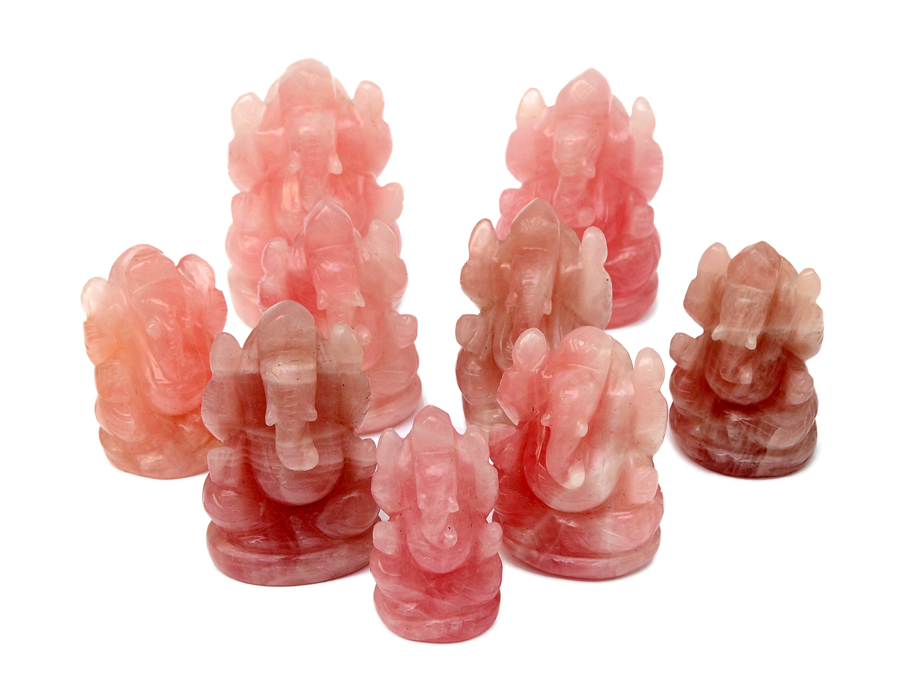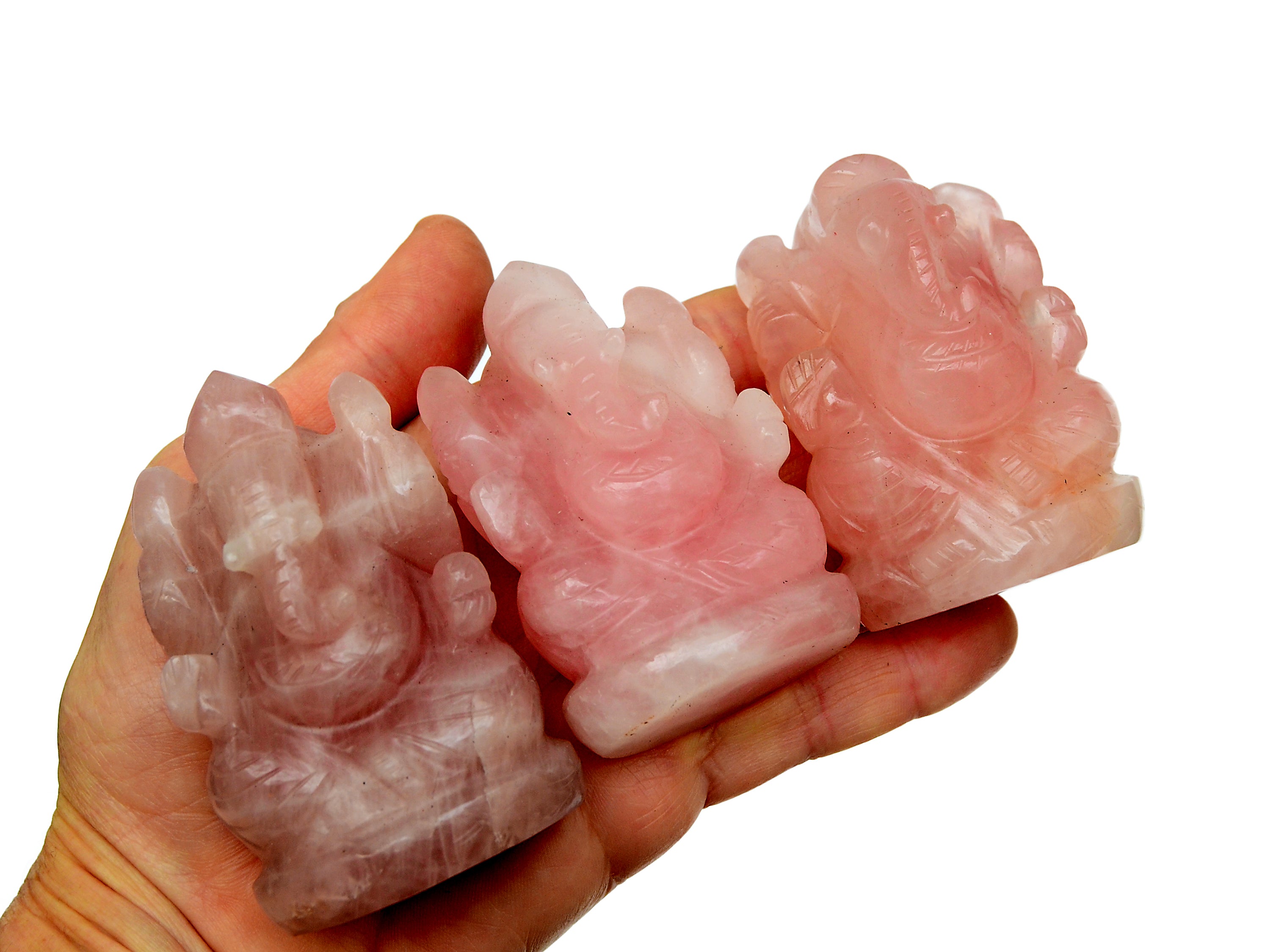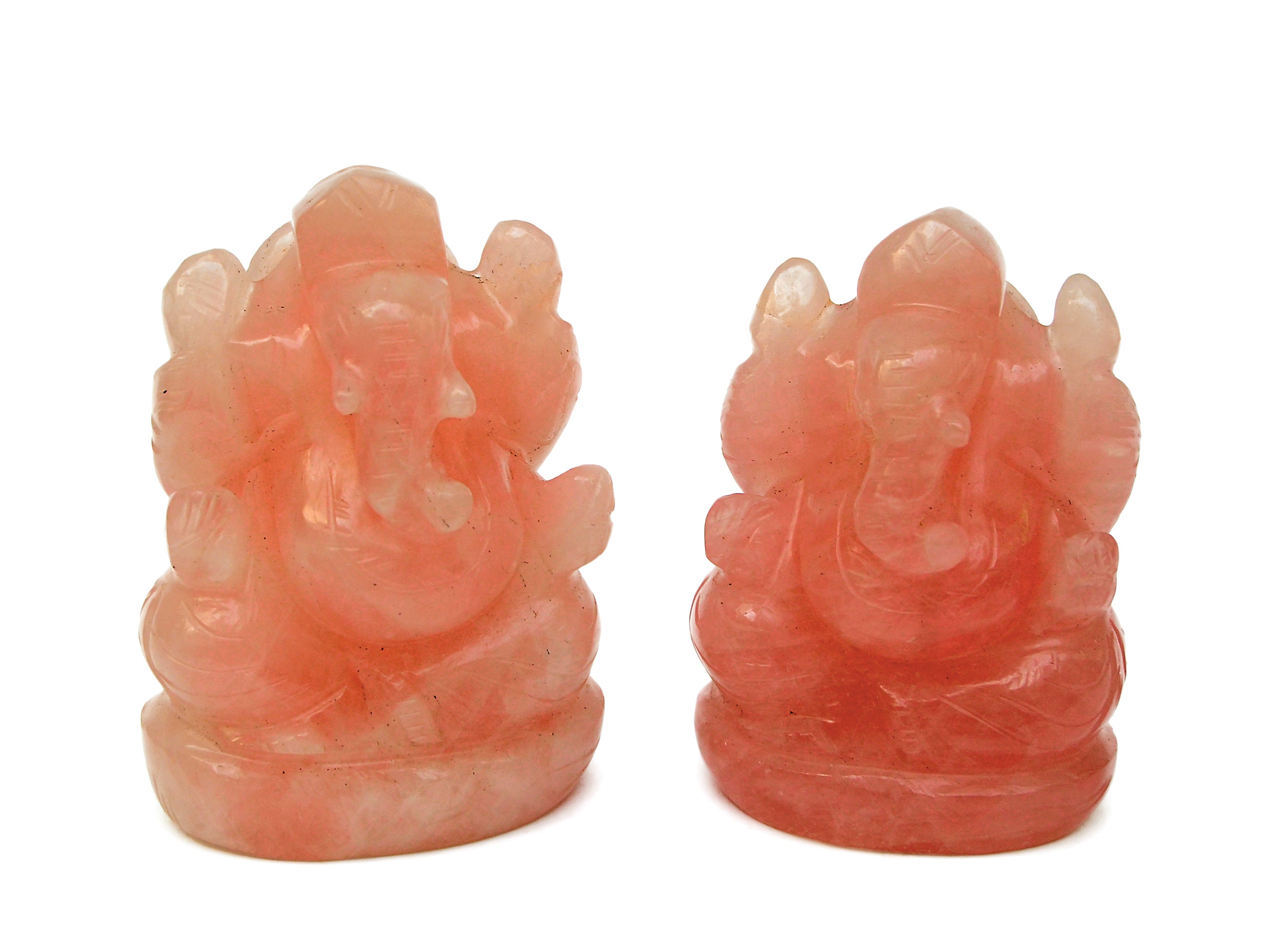 Rose quartz Ganesha sculpture. You get one hand-carved pink quartz crystal figure very similar to appear in image above, picked at random. Please expect some slight variation in terms of color and transparency, as there are some variations unique for each stone. Note that all crystals are natural, so sometimes little imperfections can appear.