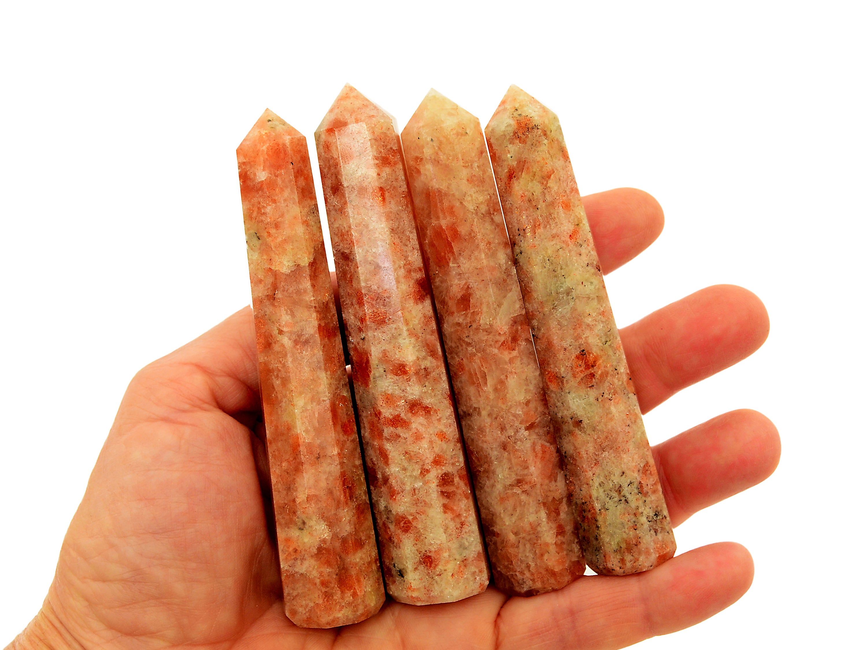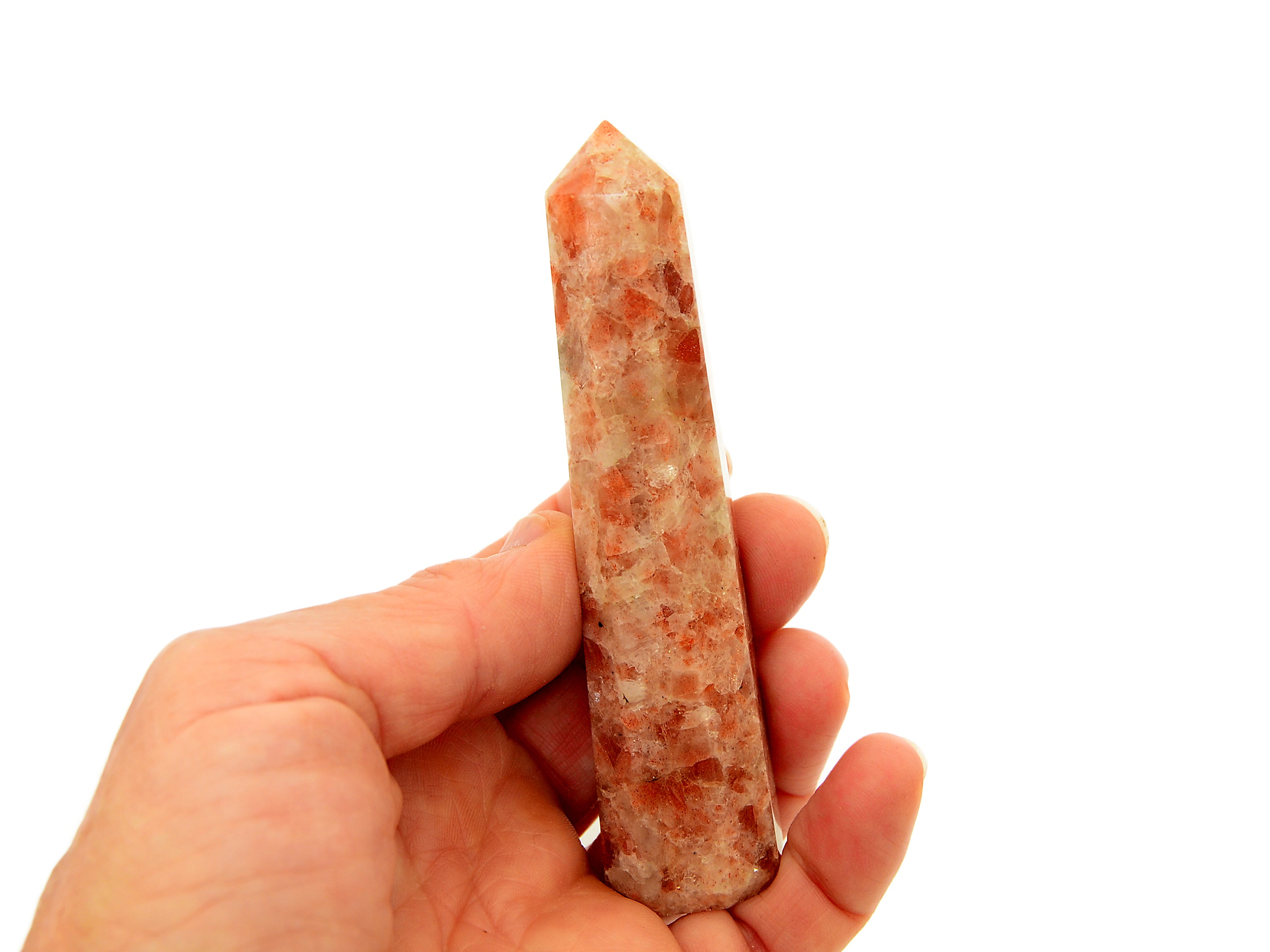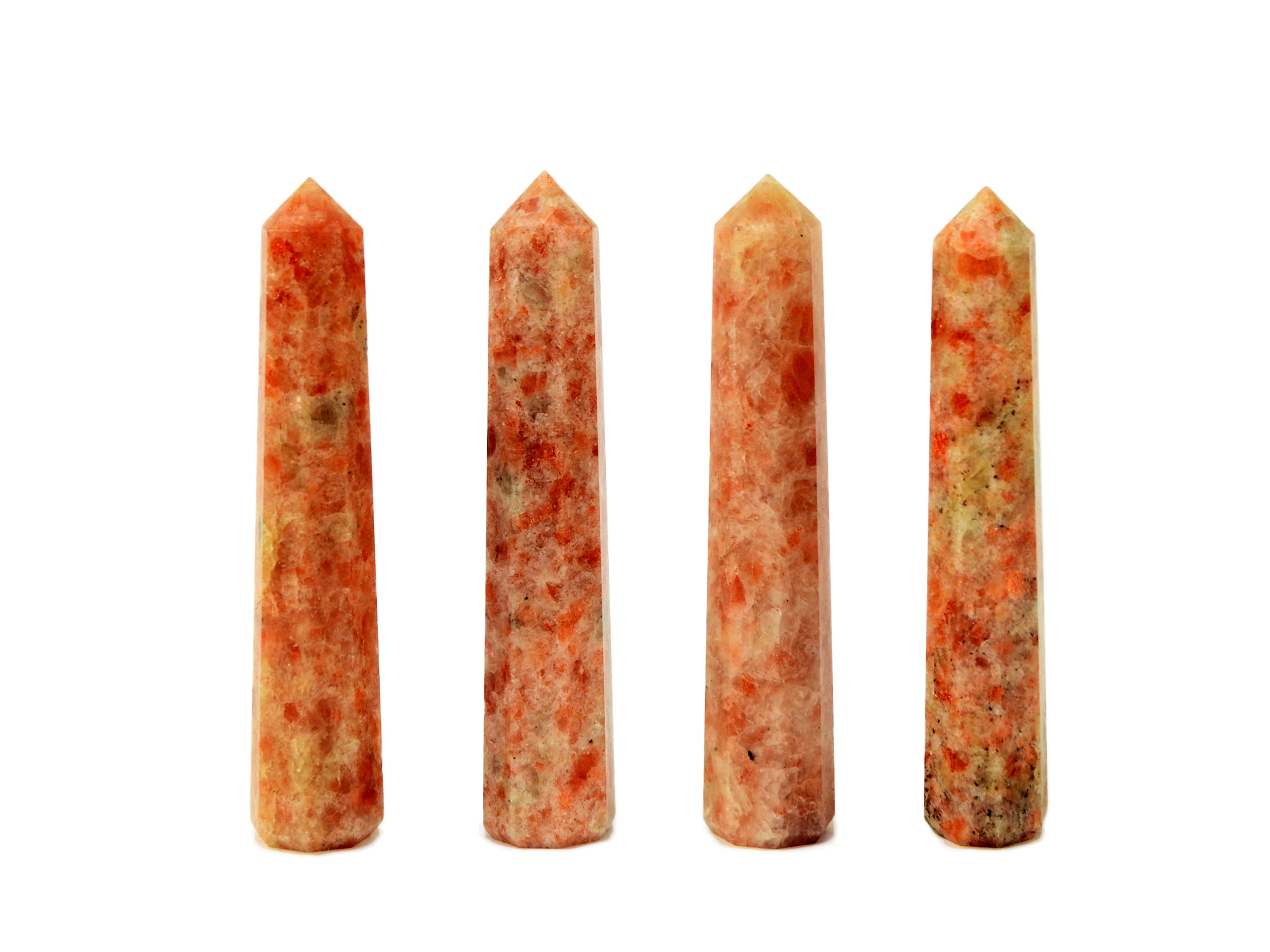 Natürlicher Sonnenstein-Spitze. Sie erhalten einen Turm, der dem auf dem Bild oben sehr ähnlich ist, zufällig ausgewählt. Bitte erwarten Sie leichte Abweichungen in Farbe und Transparenz, da jeder Stein einzigartige Variationen aufweist. Beachten Sie, dass alle Kristalle natürlich sind, sodass manchmal kleine Unvollkommenheiten auftreten können.