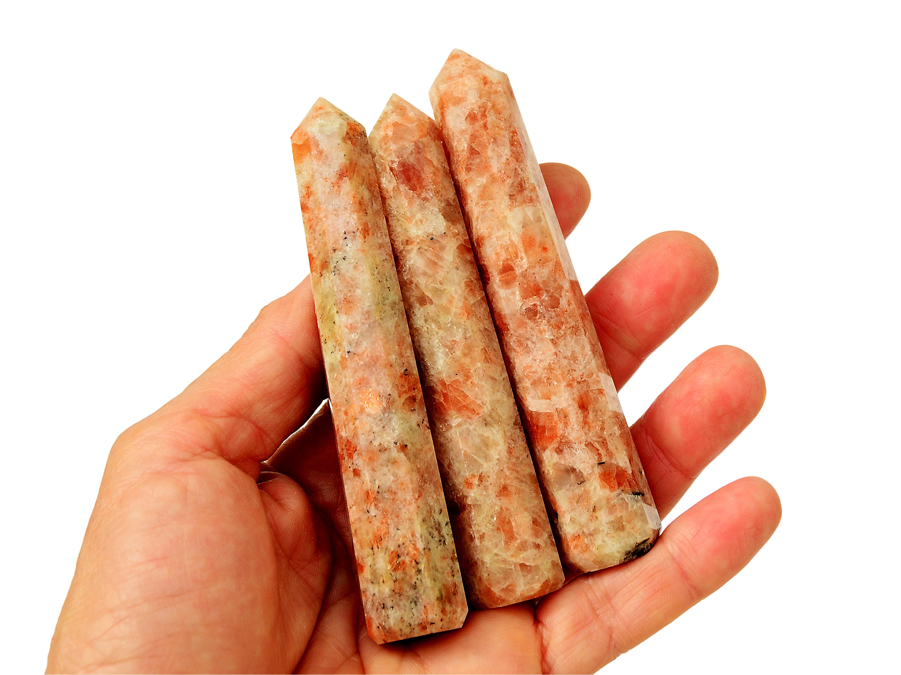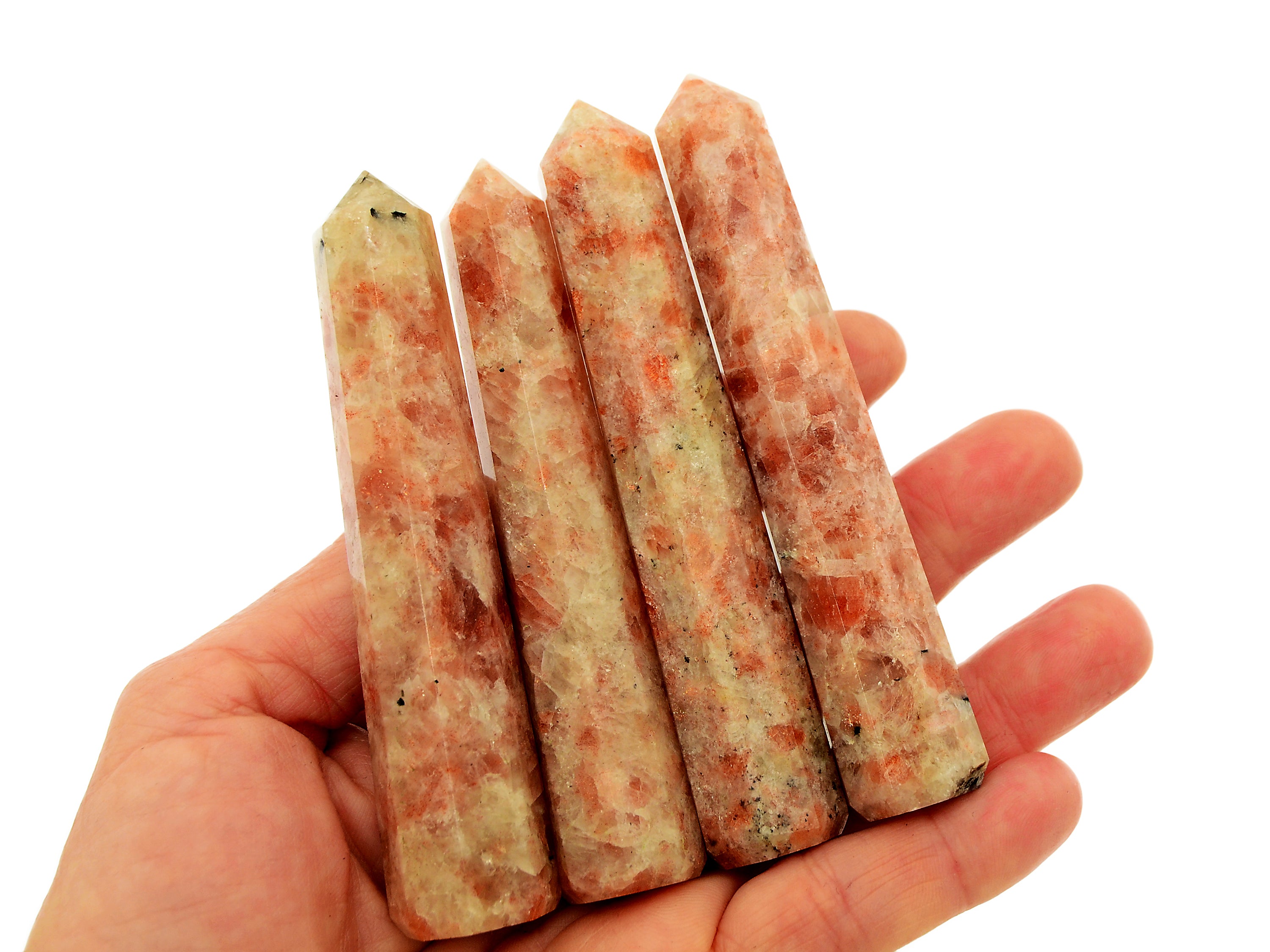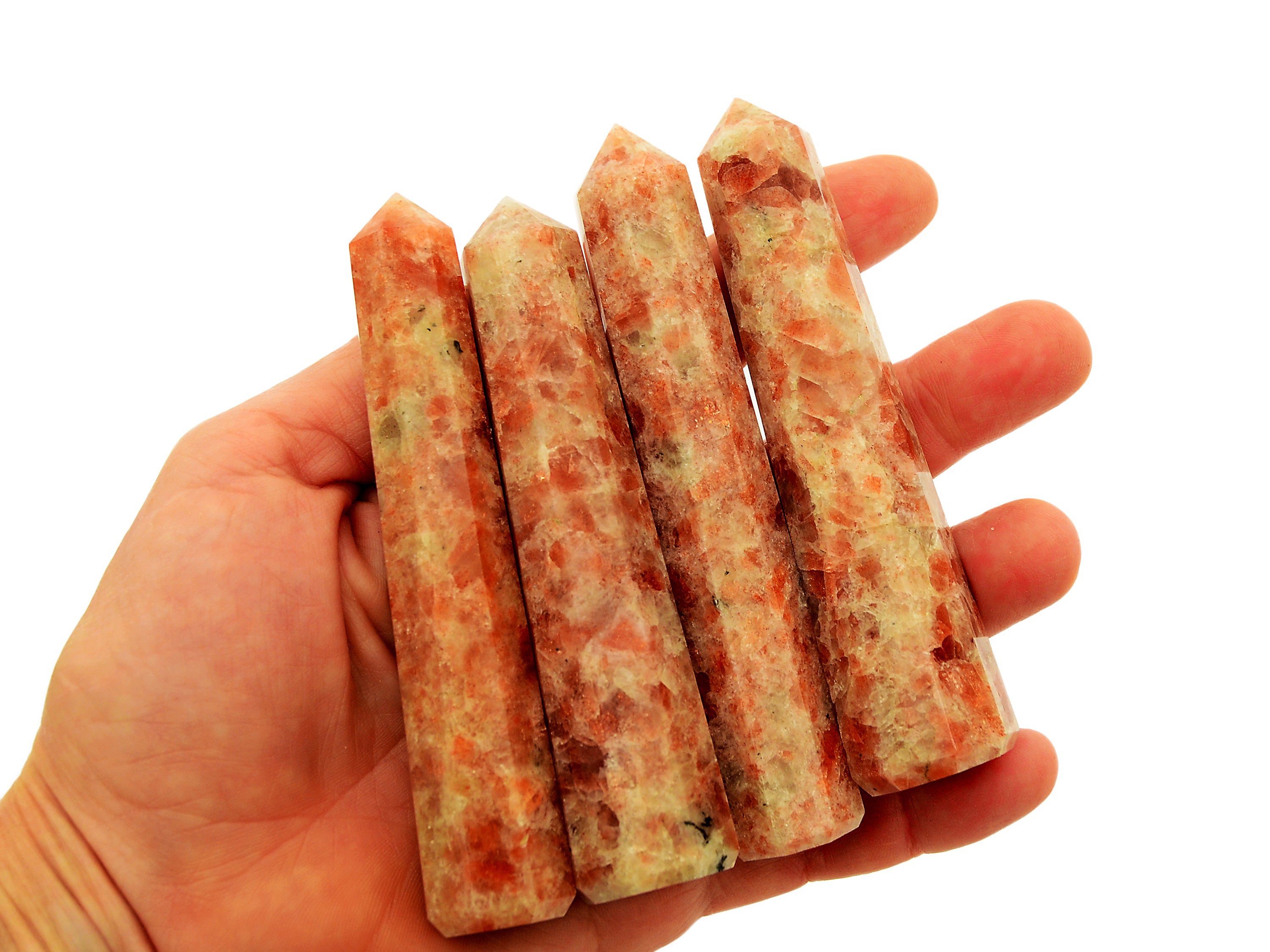 Natürlicher Sonnenstein-Spitze. Sie erhalten einen Turm, der dem auf dem Bild oben sehr ähnlich ist, zufällig ausgewählt. Bitte erwarten Sie leichte Abweichungen in Farbe und Transparenz, da jeder Stein einzigartige Variationen aufweist. Beachten Sie, dass alle Kristalle natürlich sind, sodass manchmal kleine Unvollkommenheiten auftreten können.