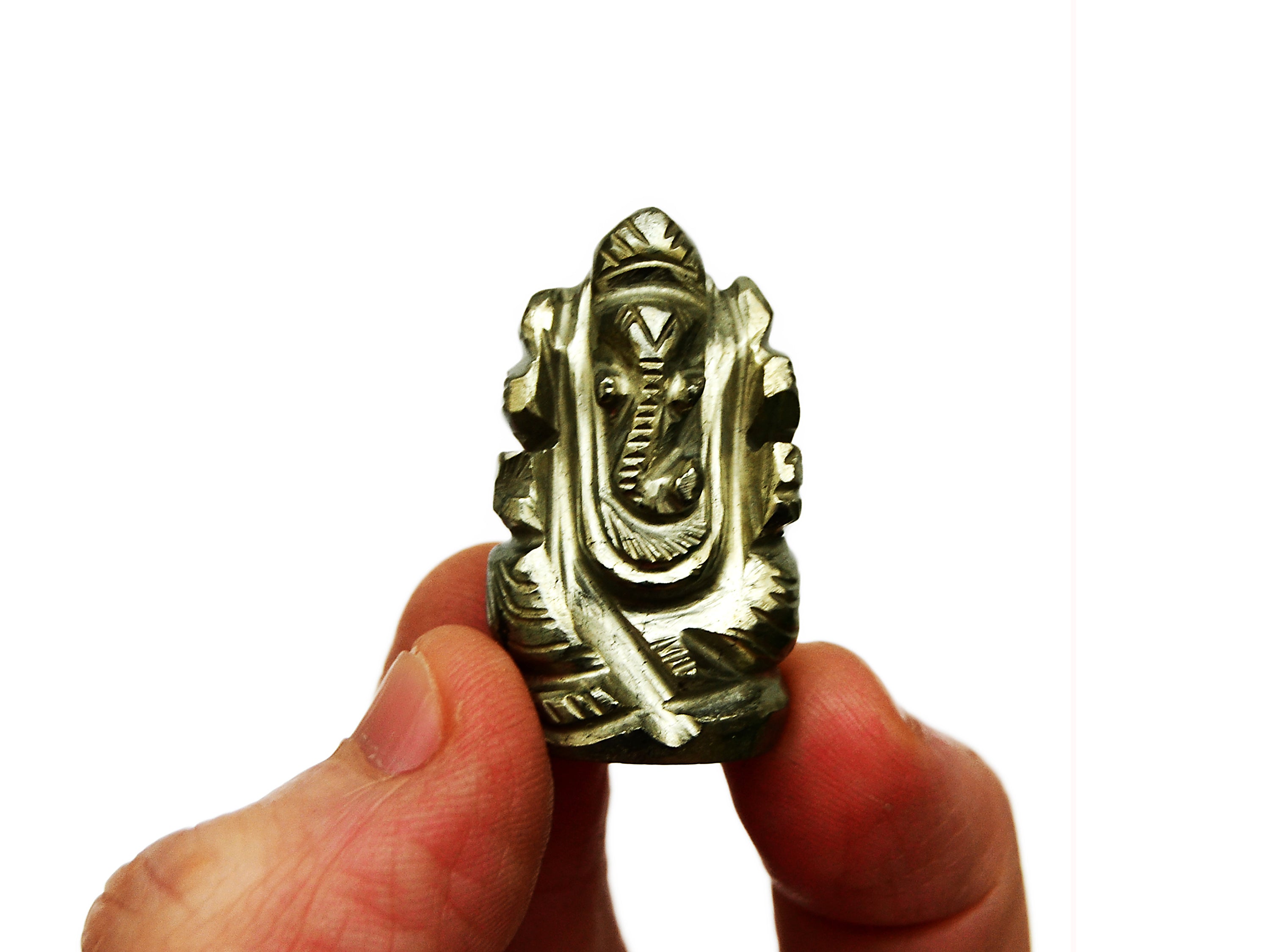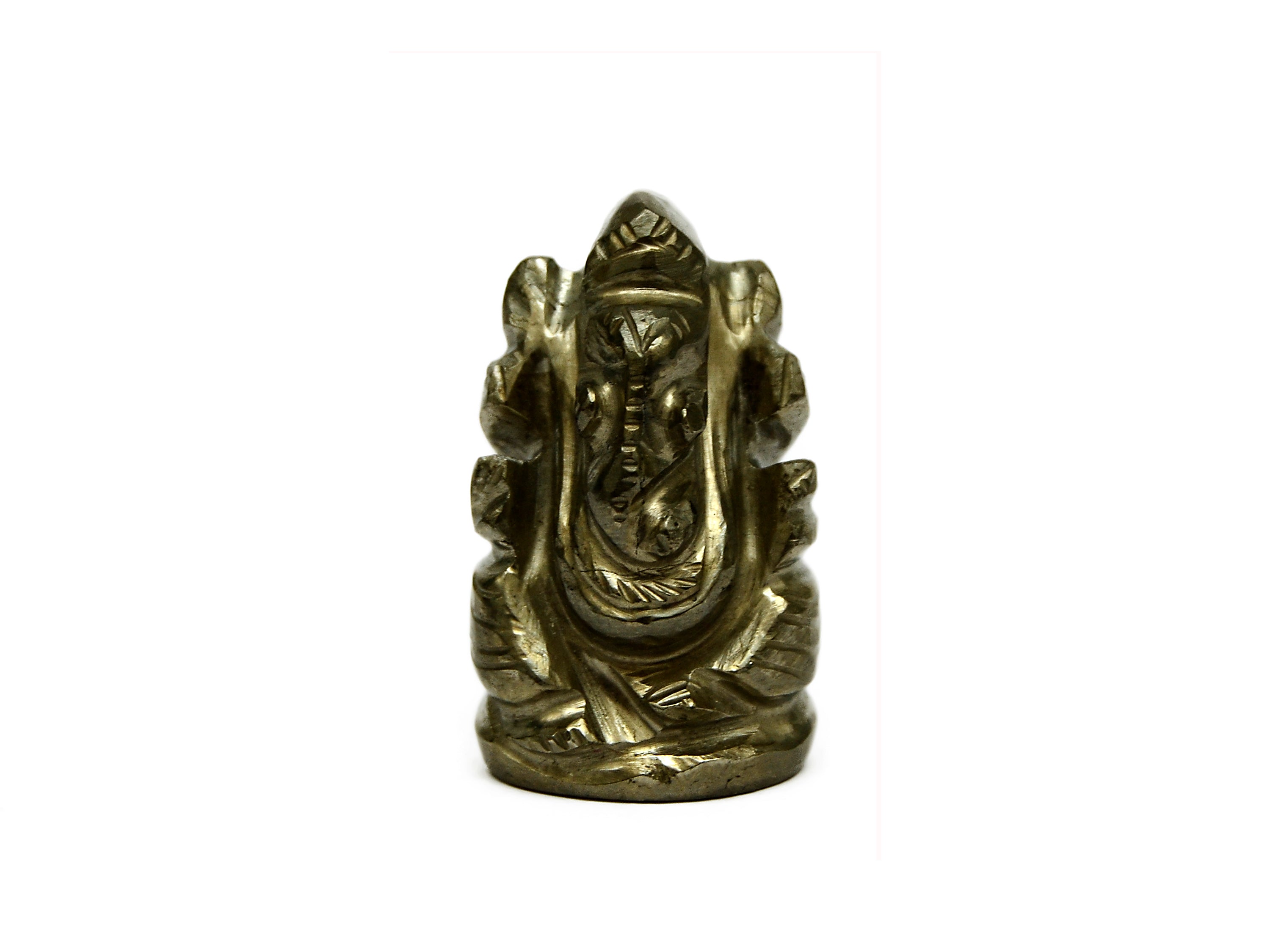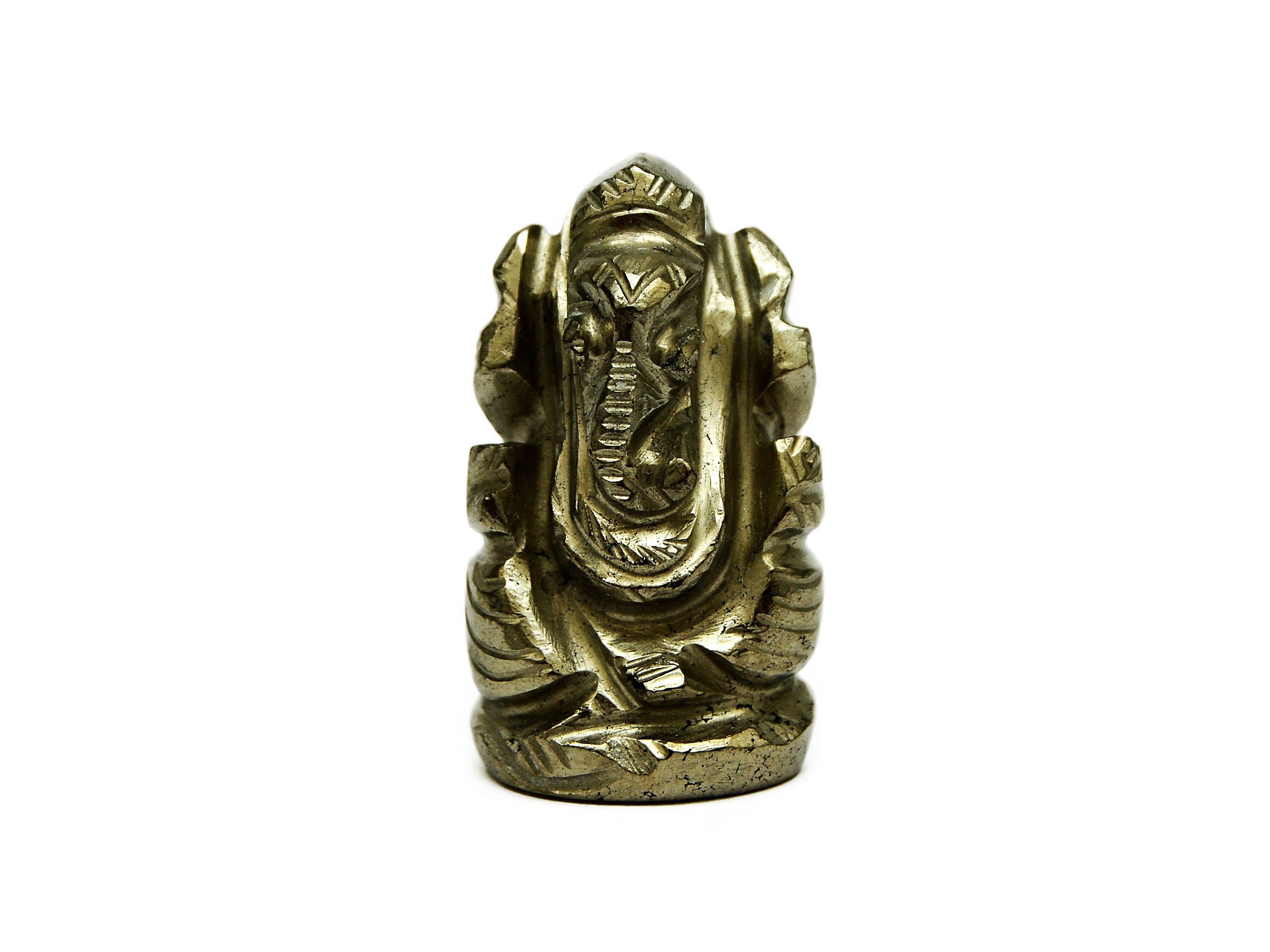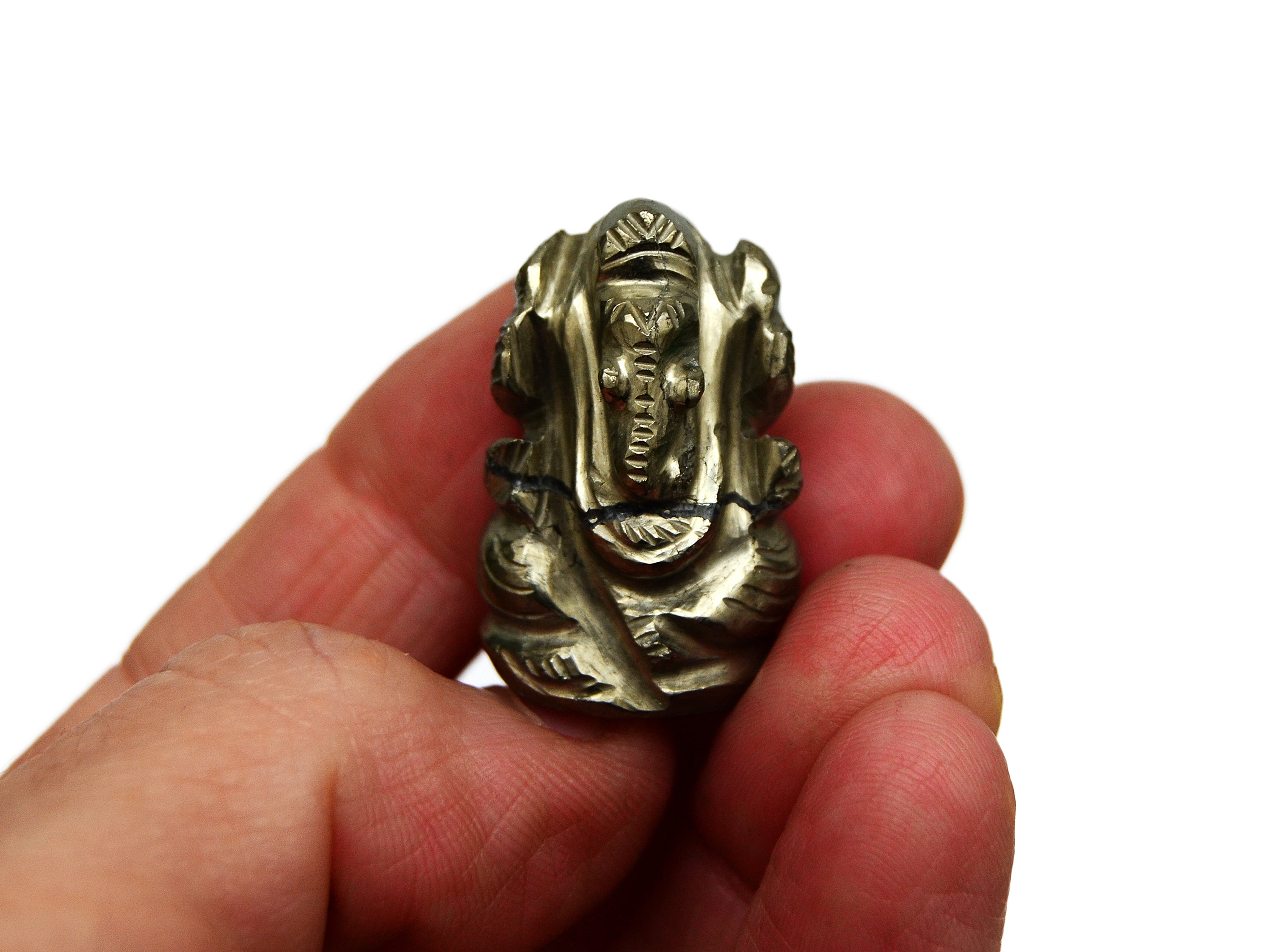 Mini scultura di Ganesha in pirite. Riceverai una figura in pietra intagliata a mano molto simile a quella mostrata nell'immagine sopra, selezionata a caso. Si prega di considerare una leggera variazione in termini di colore e trasparenza, poiché ogni pietra presenta caratteristiche uniche. Nota che tutti i cristalli sono naturali, quindi a volte possono comparire piccole imperfezioni.