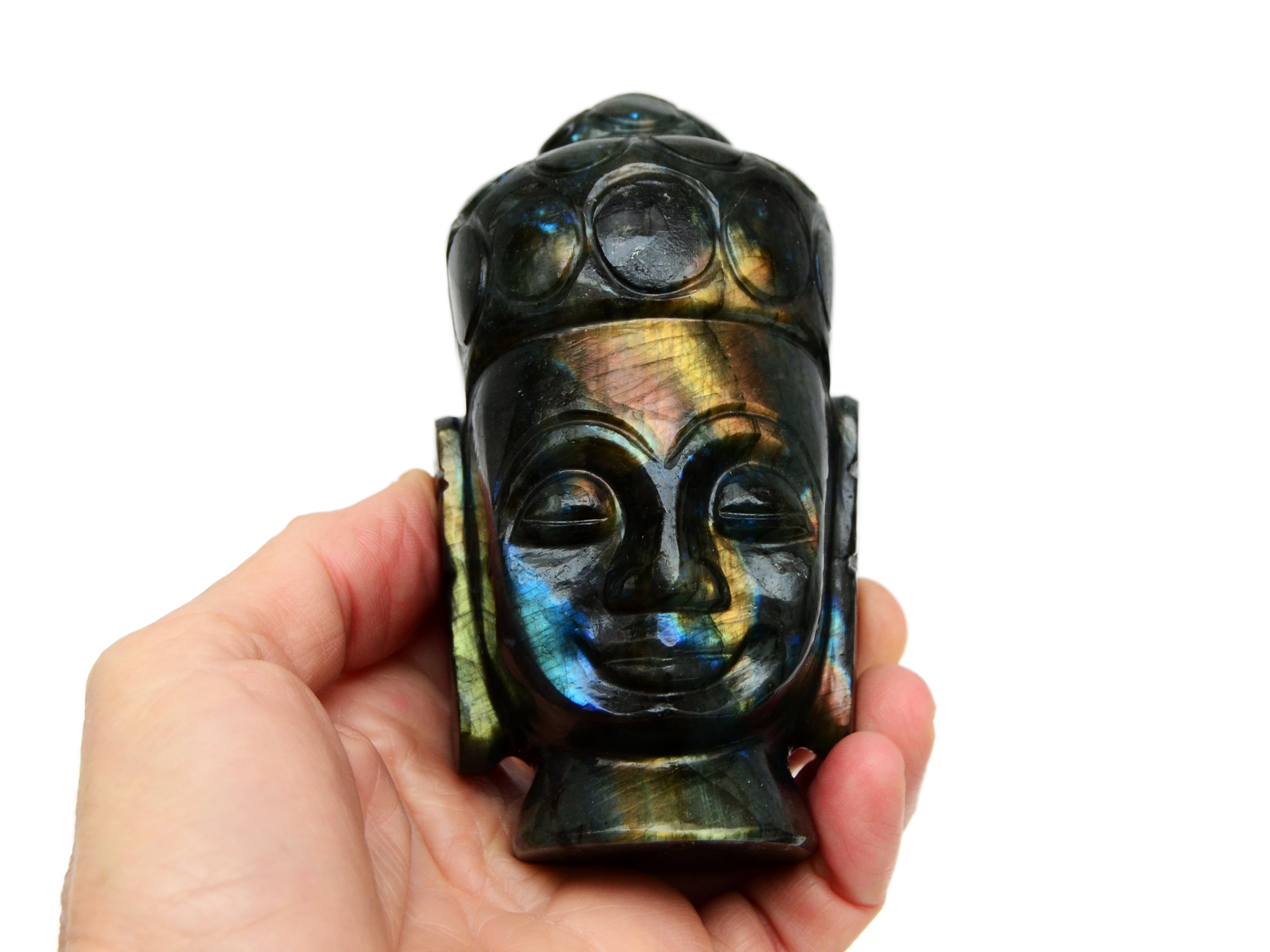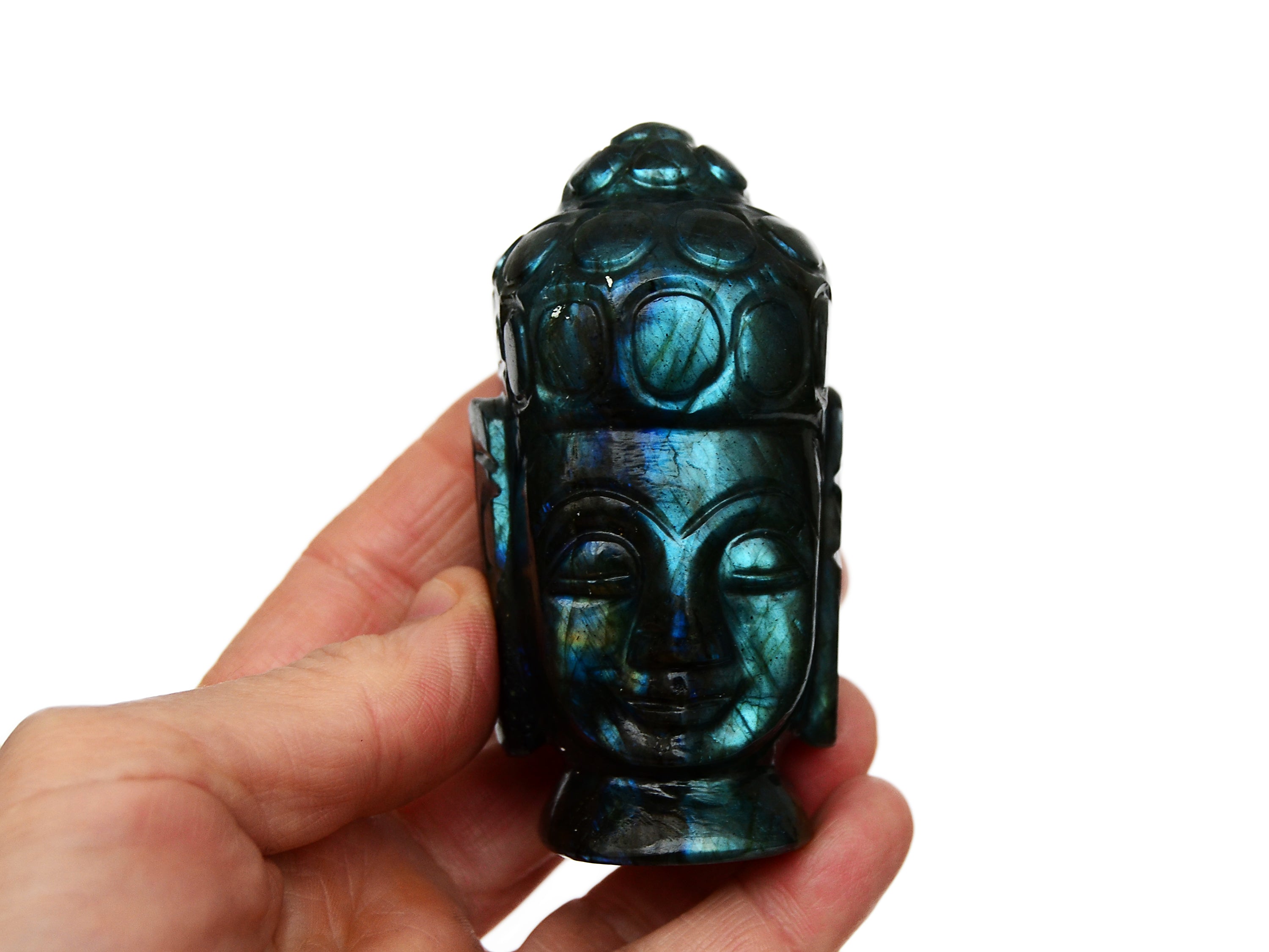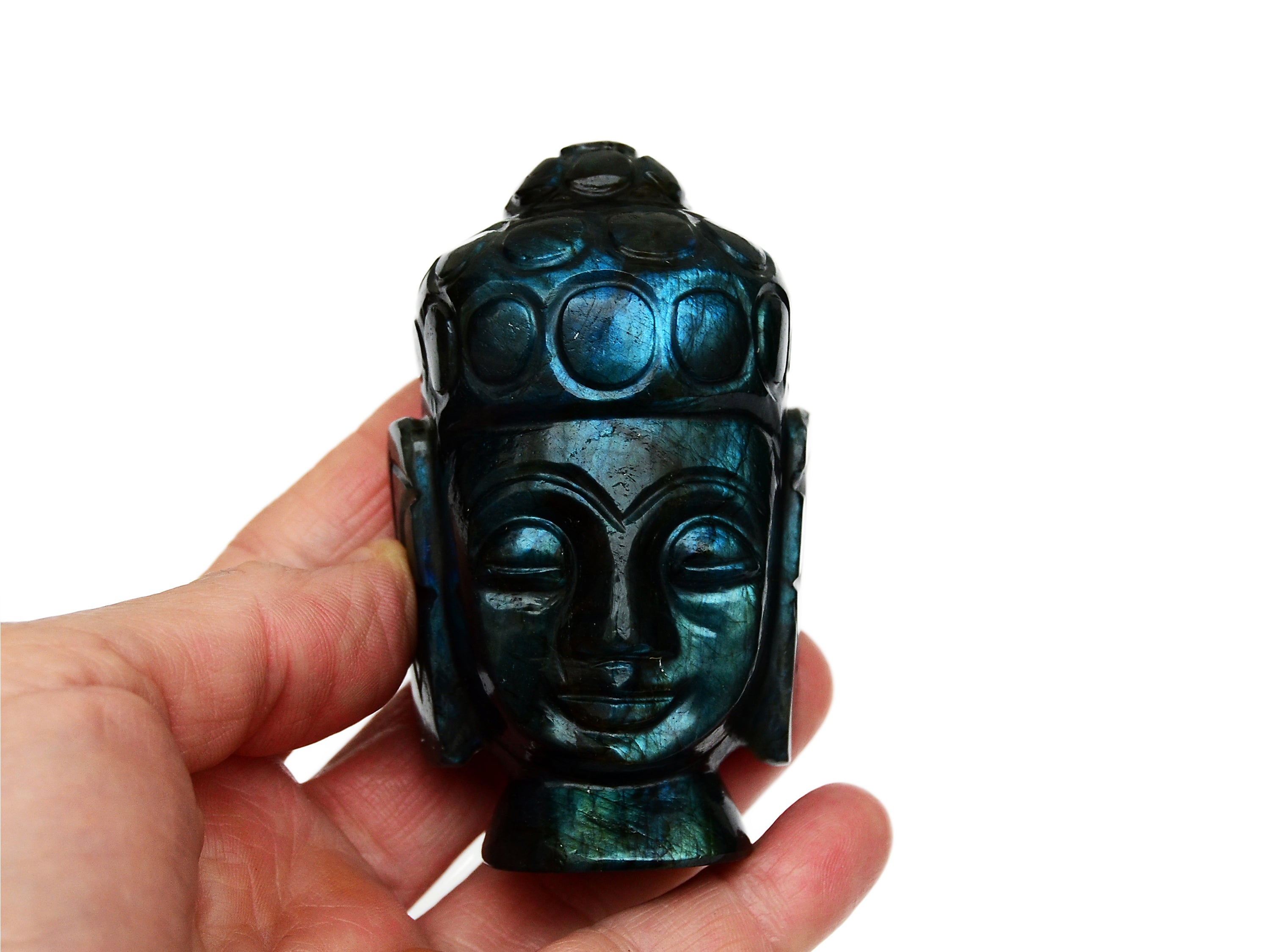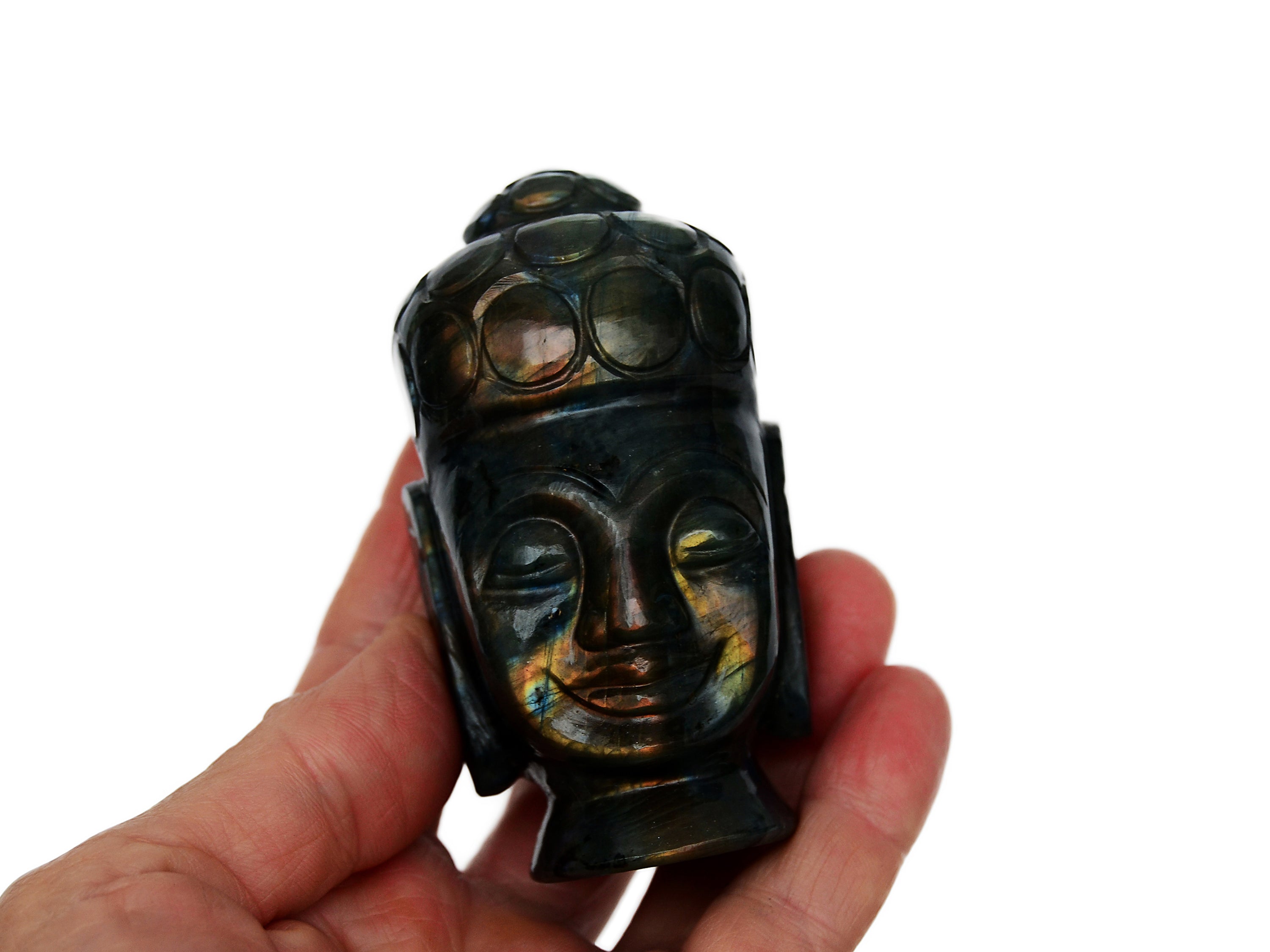 Labradorite Buddha head sculpture. You get one hand-carved crystal very similar to appear in image above, picked at random. Note that all crystals are natural, so sometimes little imperfections can appear.