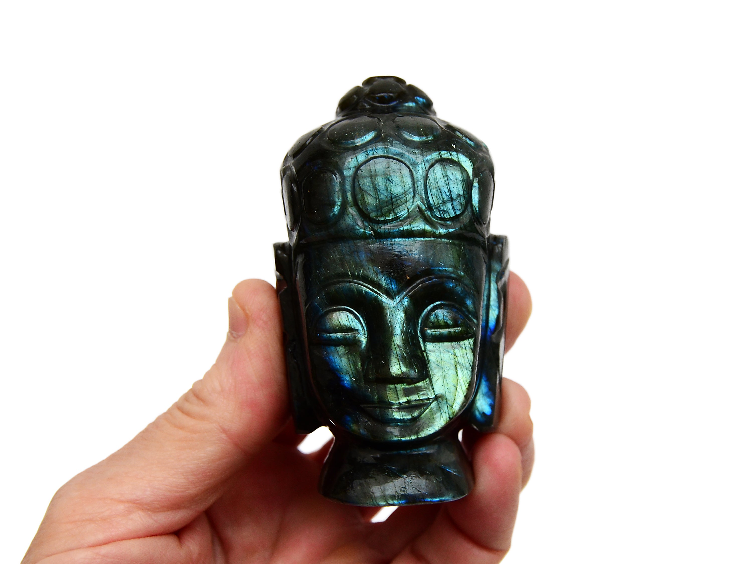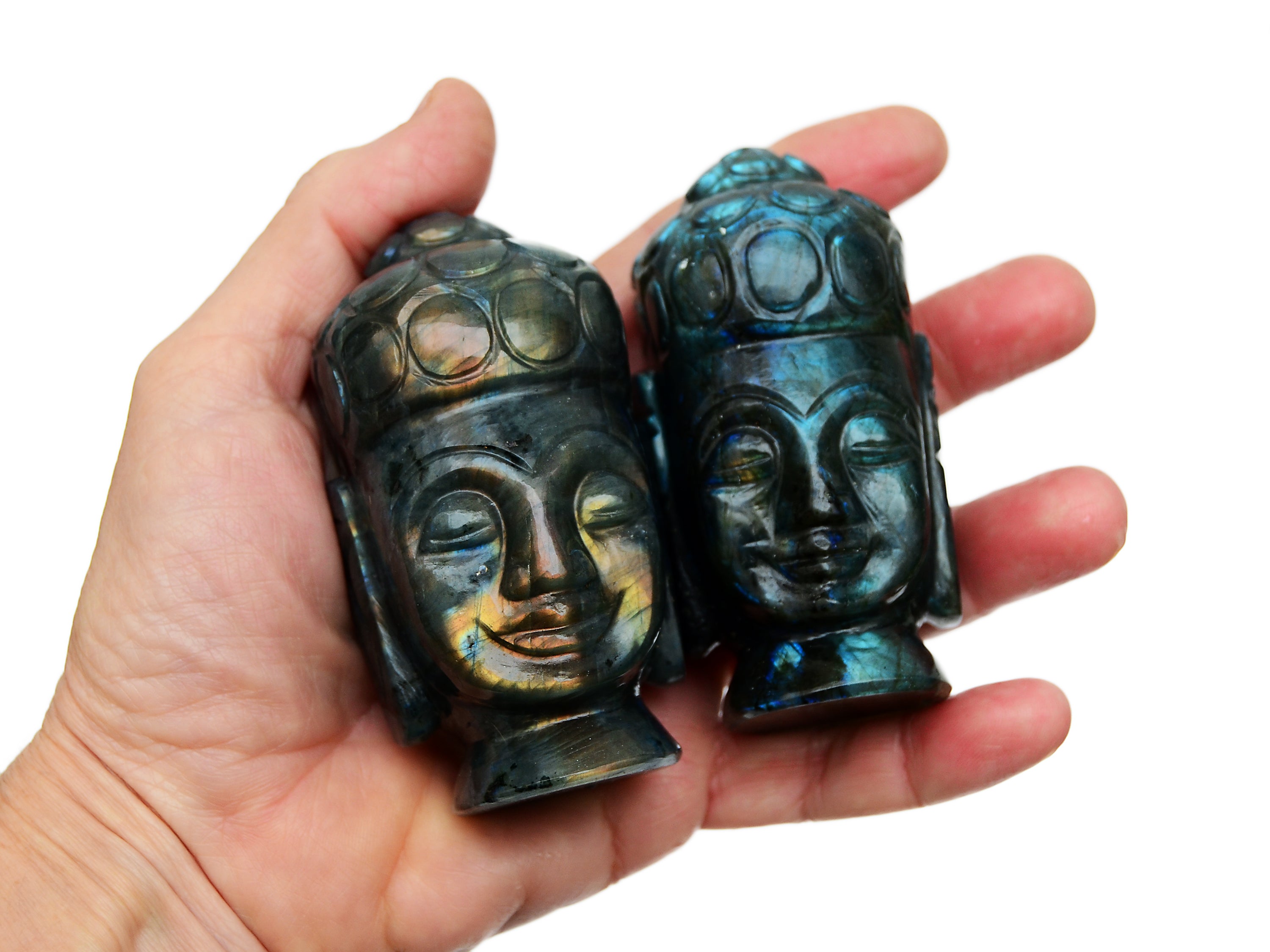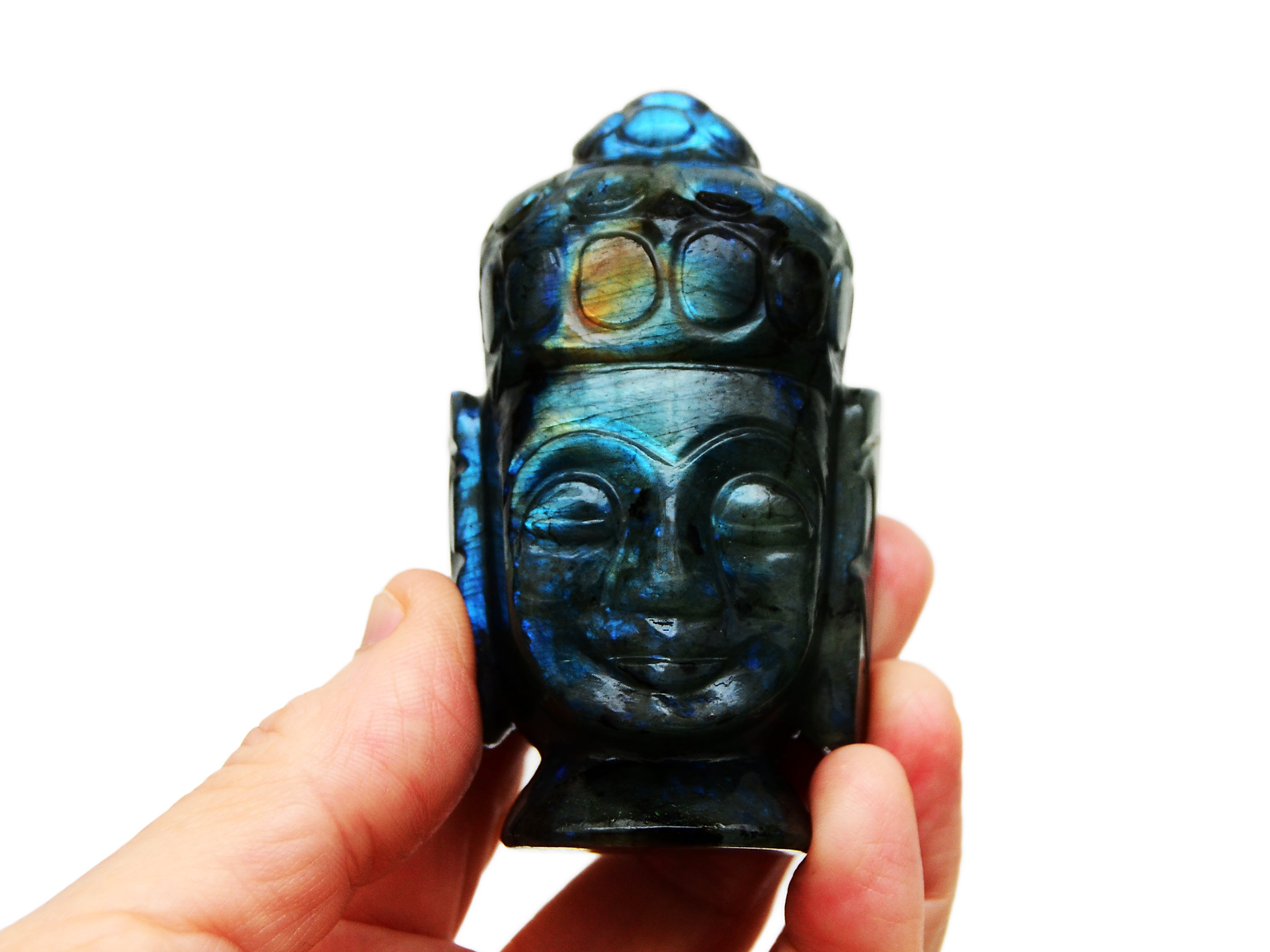 Labradorite Buddha head sculpture. You get one hand-carved crystal very similar to appear in image above, picked at random. Note that all crystals are natural, so sometimes little imperfections can appear.