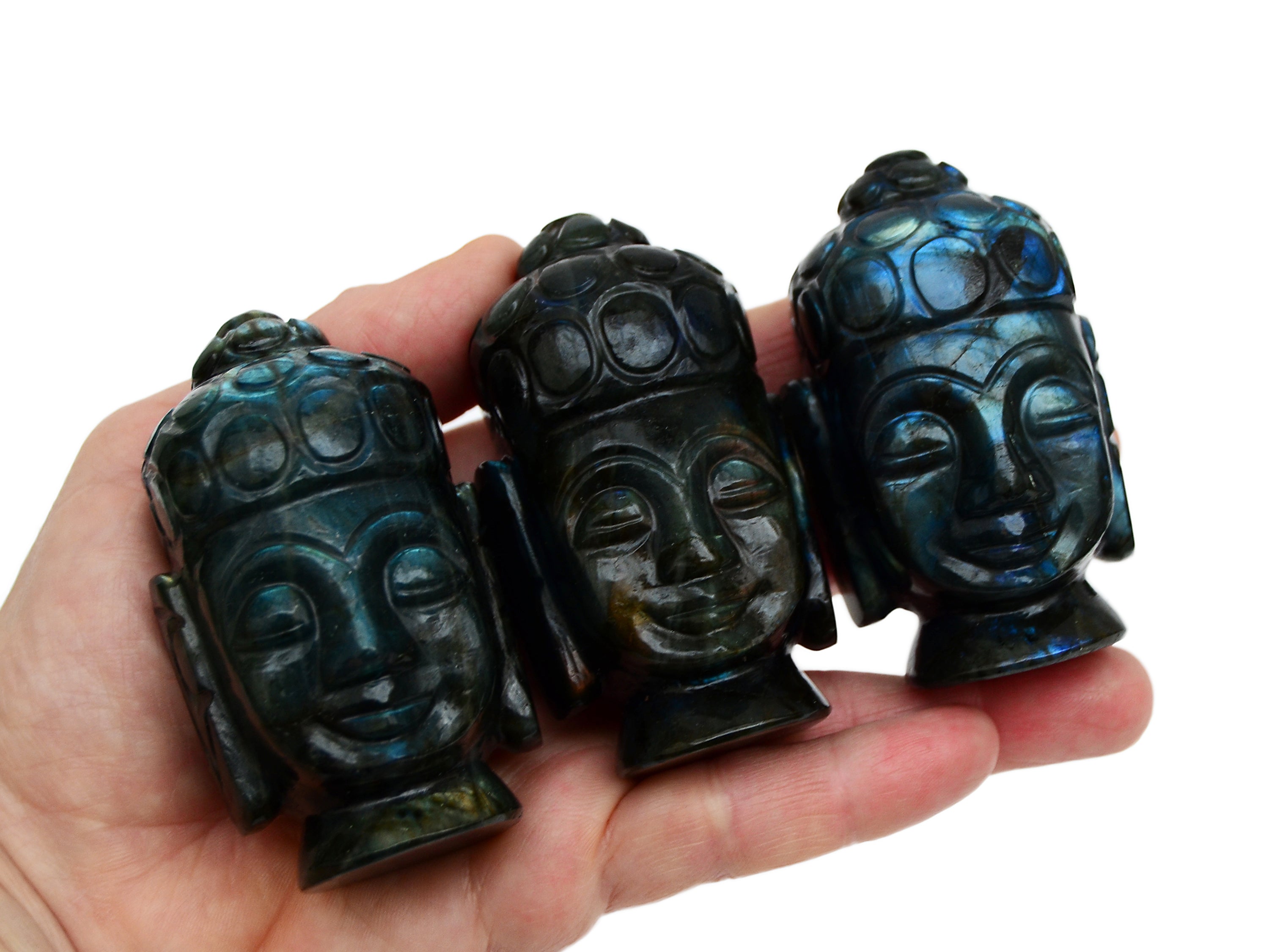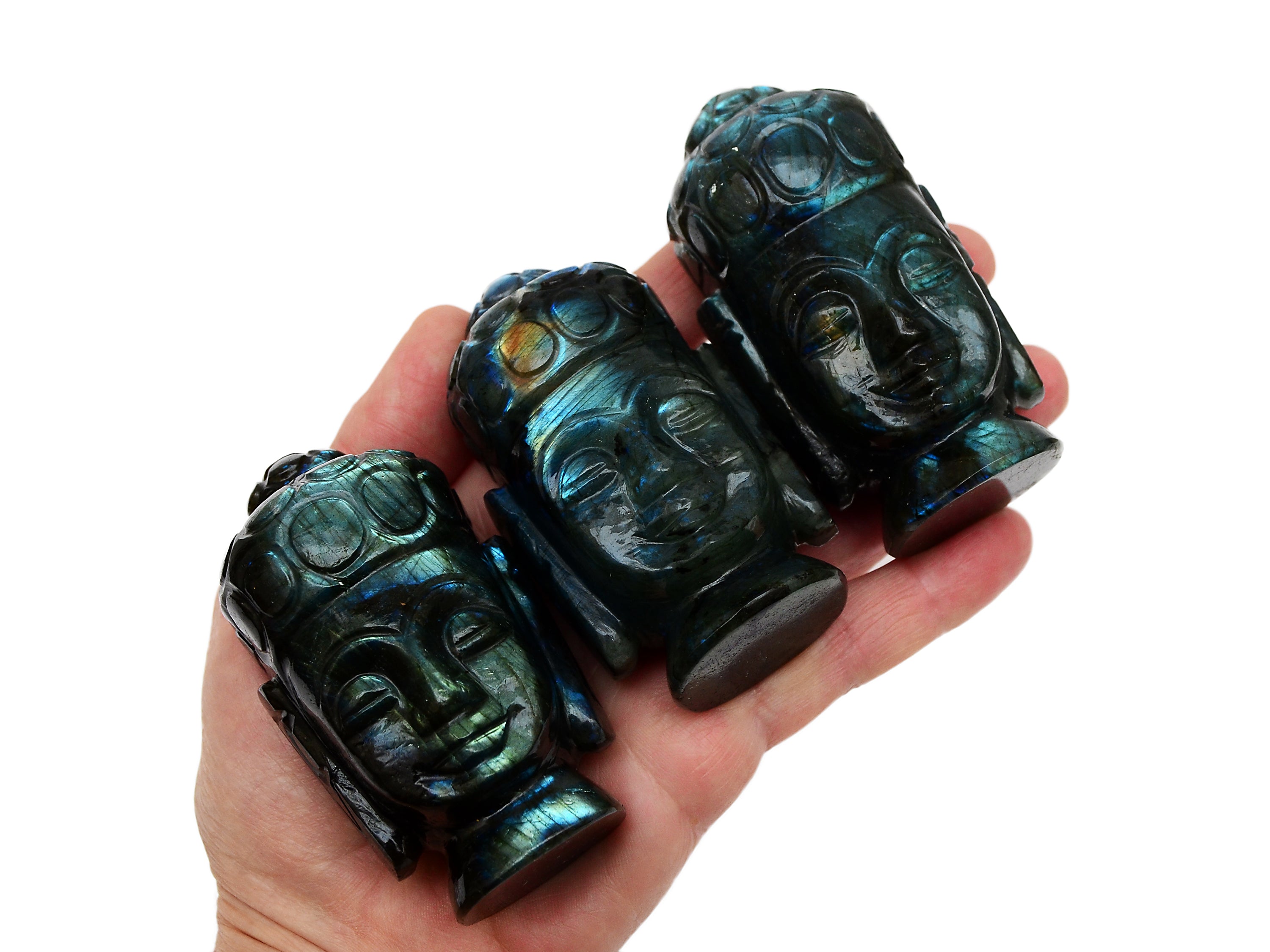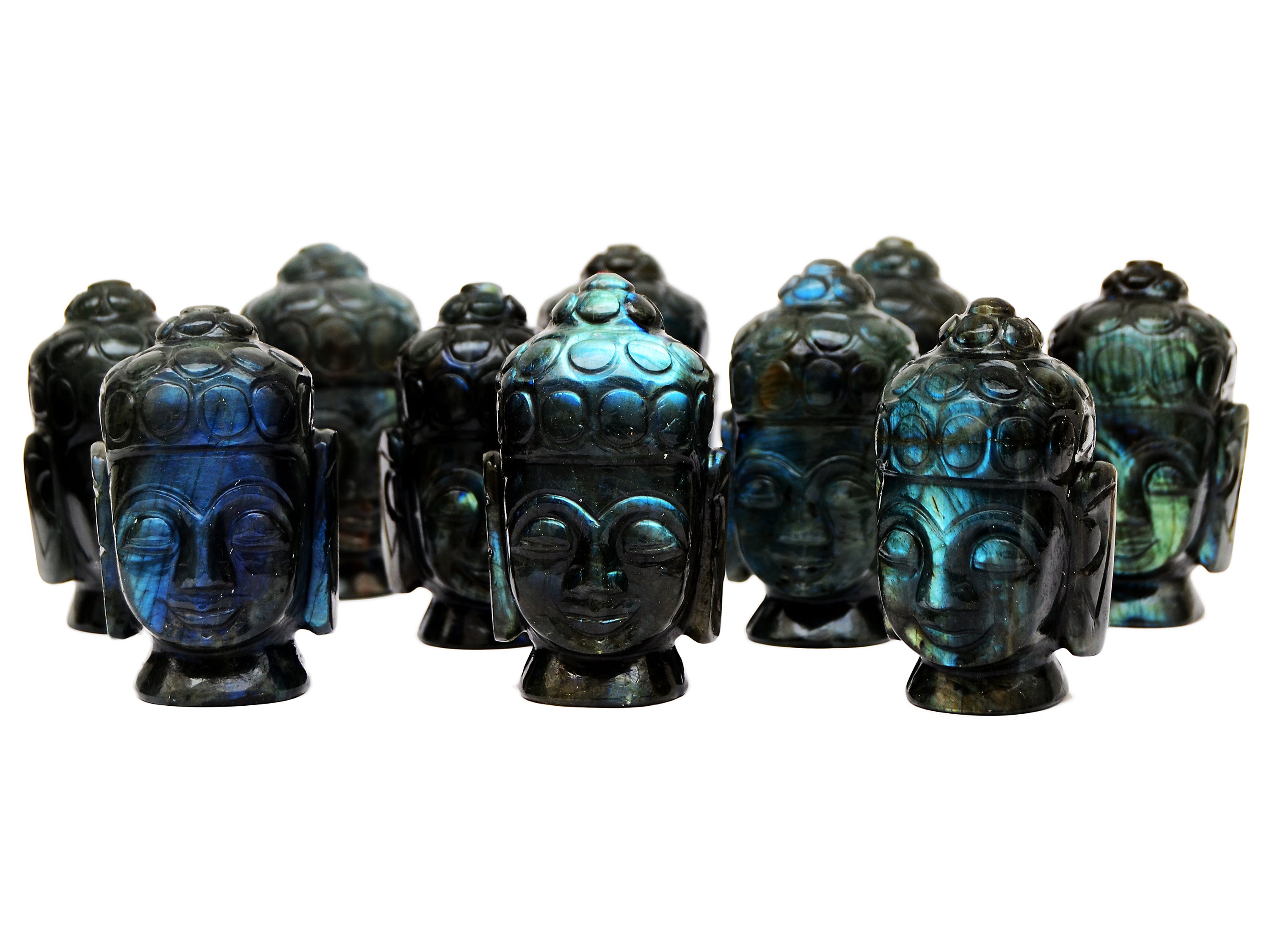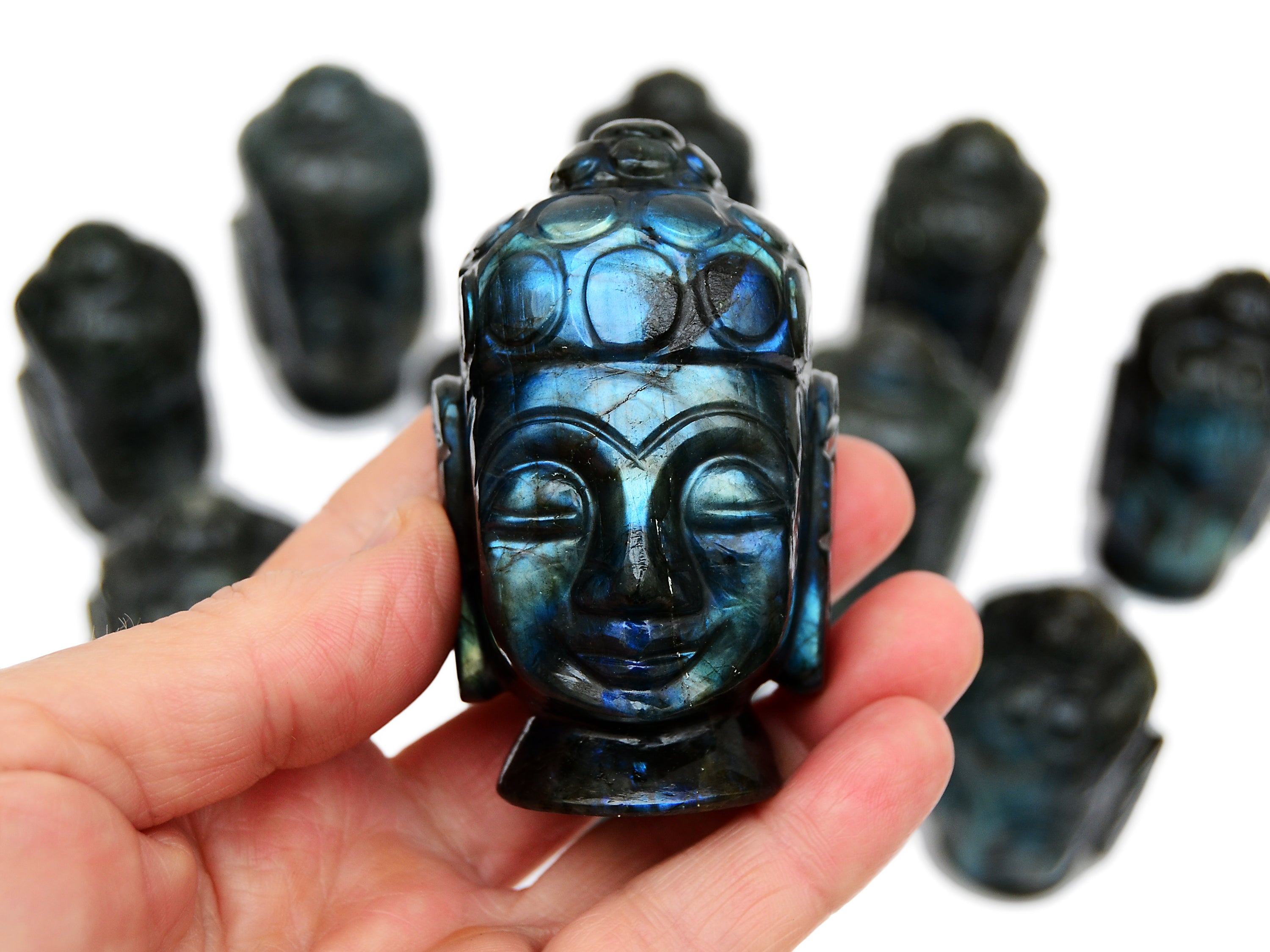 Labradorite Buddha head sculpture. You get one hand-carved crystal very similar to appear in image above, picked at random. Note that all crystals are natural, so sometimes little imperfections can appear.
